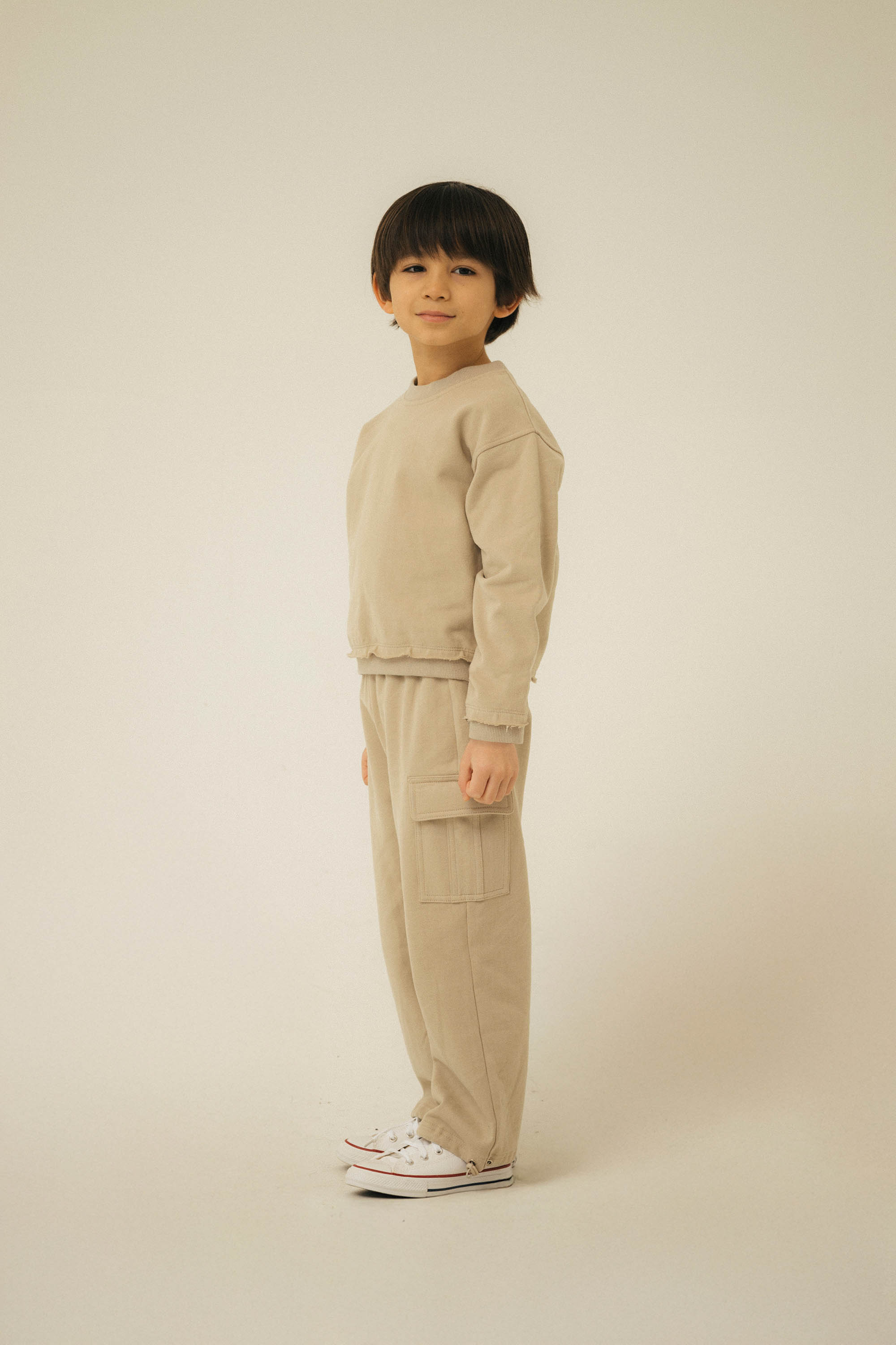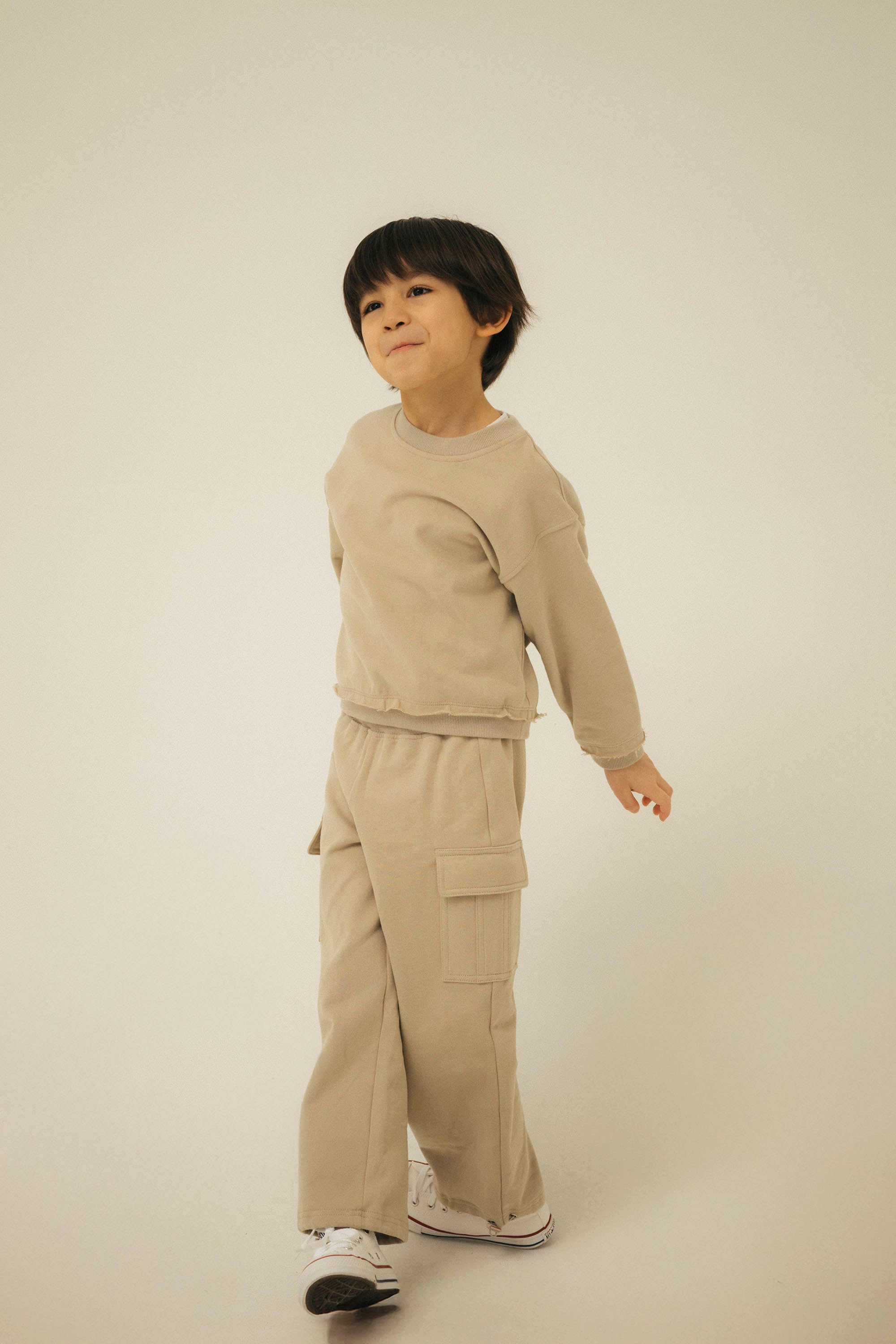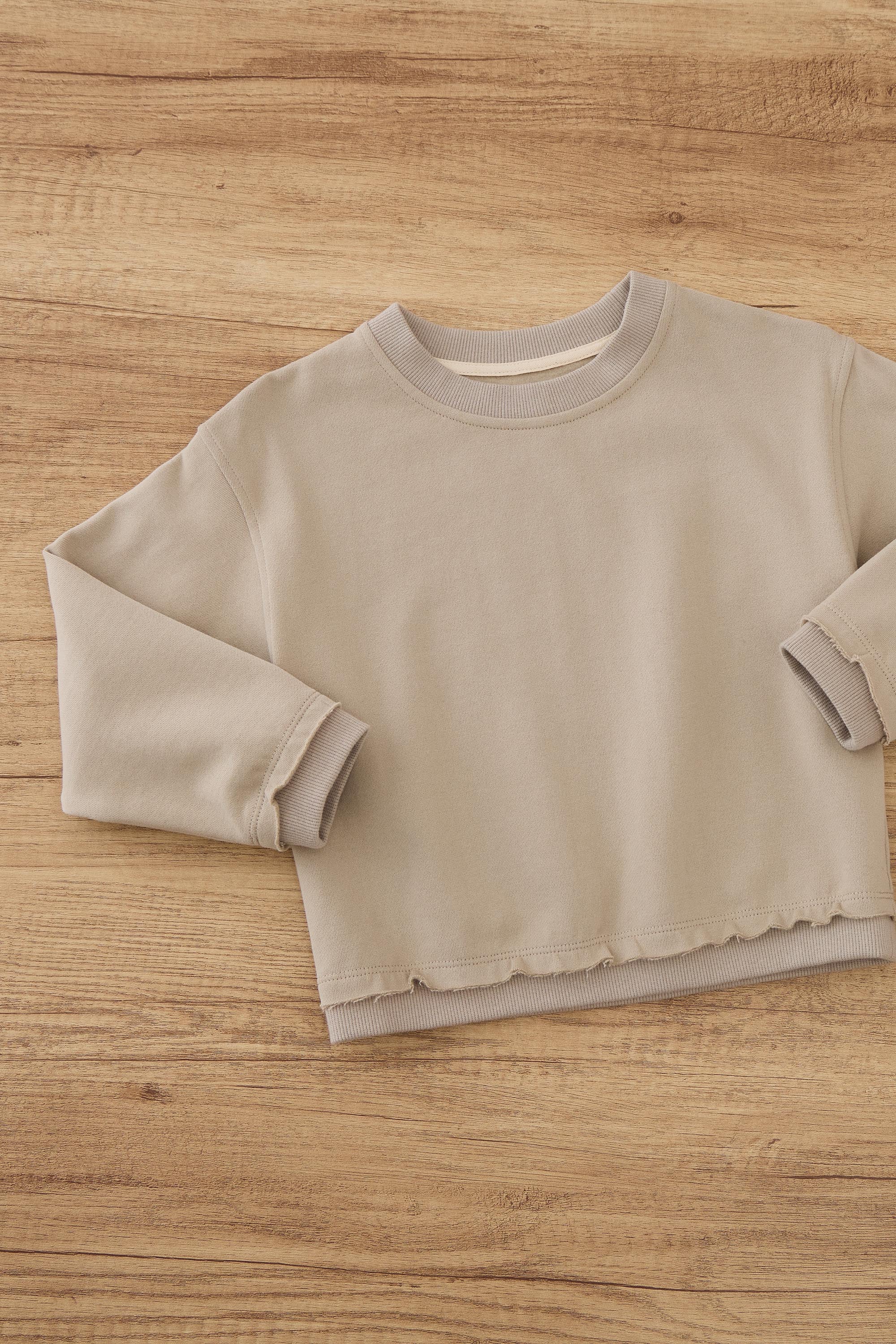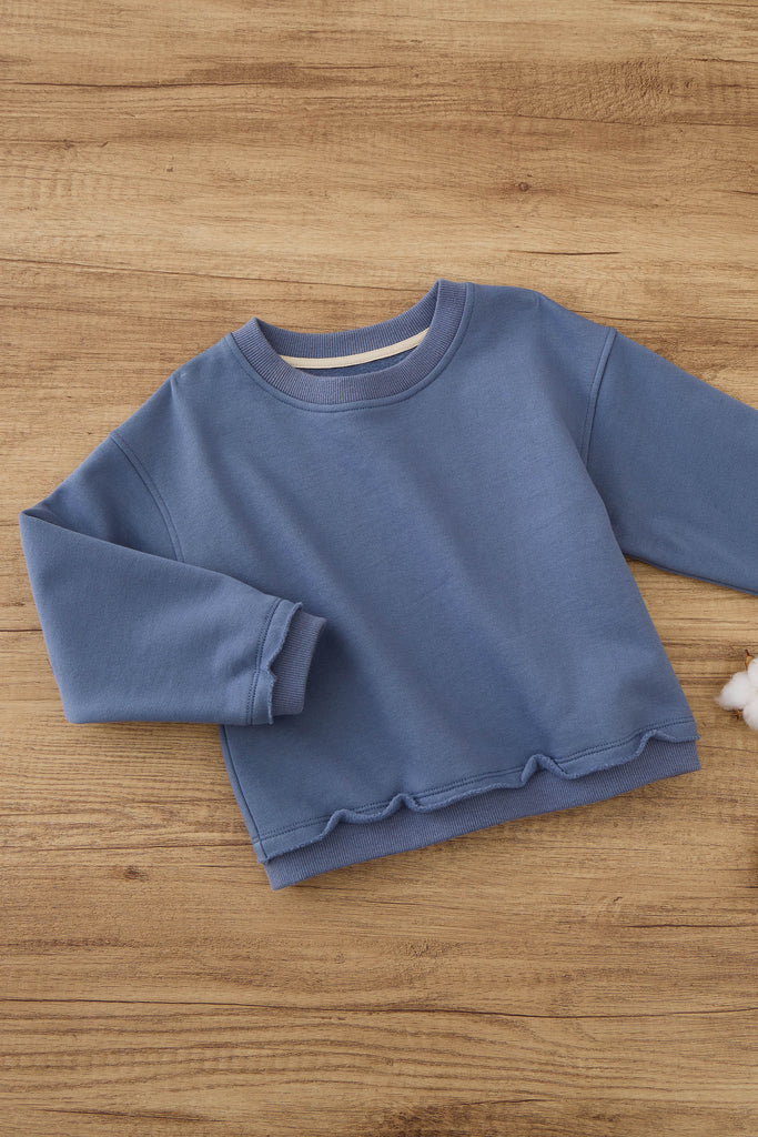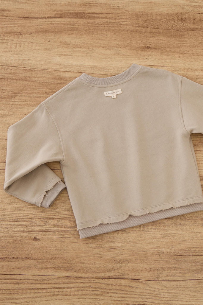 This relaxed kids sweatshirt is thoughtfully designed with a raw hem finish at the bottom that transitions smoothly into ribbing, creating a balanced mix of ease and structure that feels casual, modern, and comfortable for everyday wear. The soft fabric drapes gently on the body, making it an easy piece for children to layer over tees or wear on its own throughout the fall and winter seasons when they need a little extra warmth during school days, outdoor play, or cozy moments at home. Its simple and versatile silhouette pairs well with many outfits, allowing it to become a practical and dependable wardrobe staple for cooler weather. Crafted from 100 percent GOTS certified premium Organic Cotton, this sweatshirt reflects a thoughtful approach to environmental and social responsibility. The cotton is grown without toxic pesticides or synthetic fertilizers, resulting in a fabric that feels gentle and safe on children’s skin.
