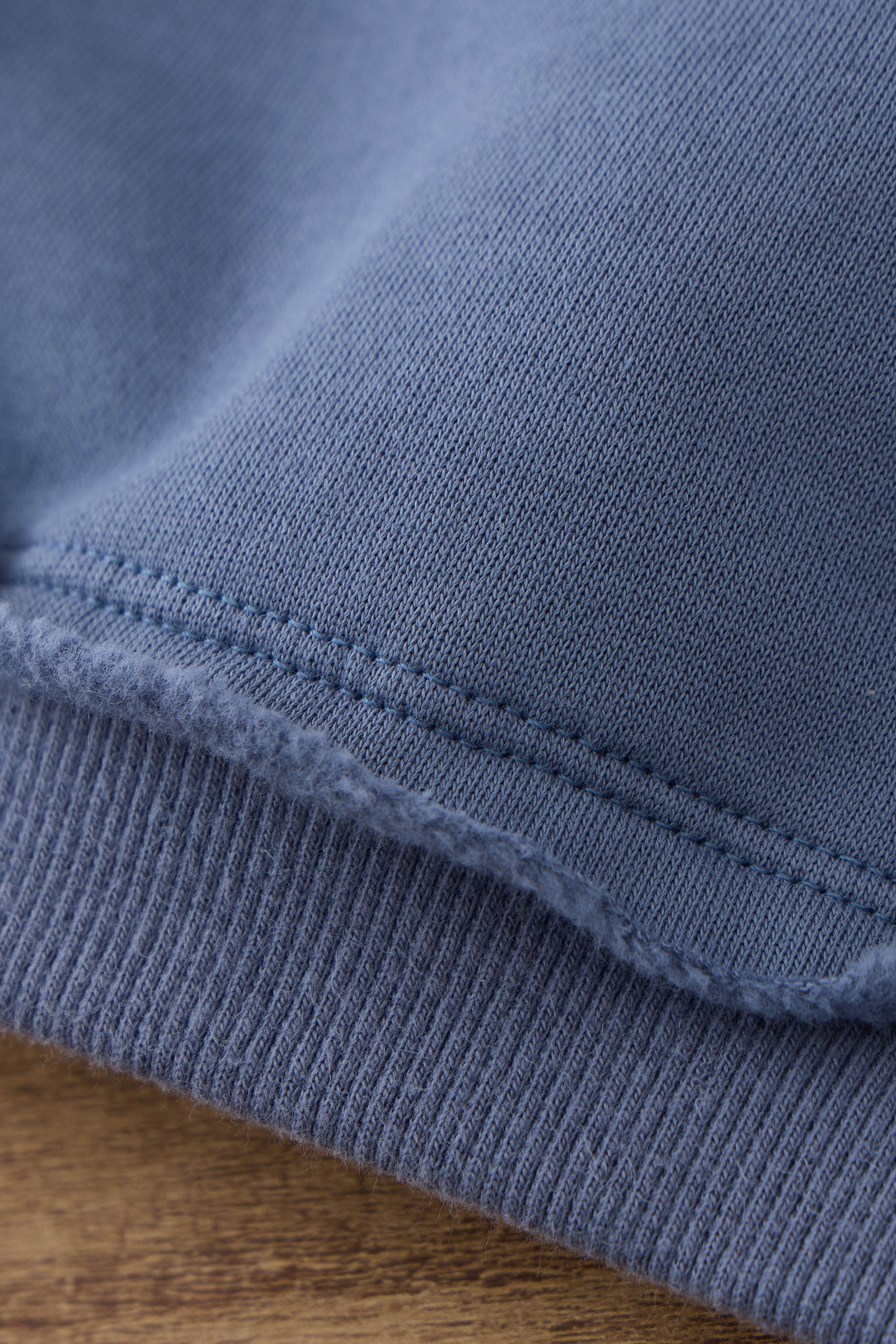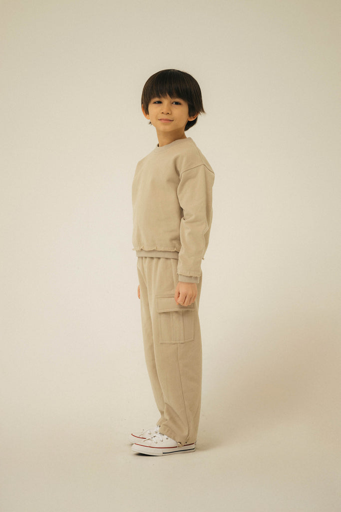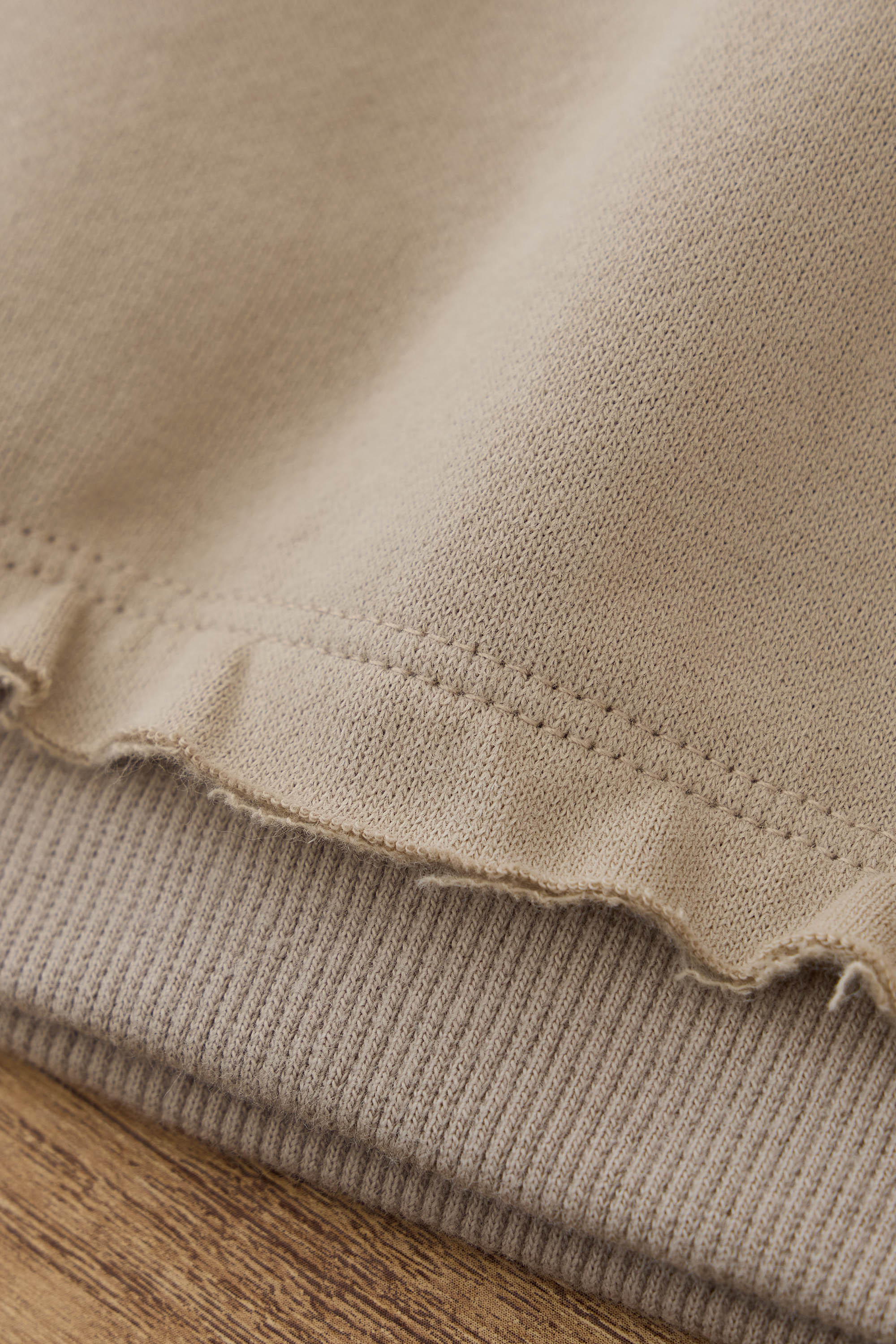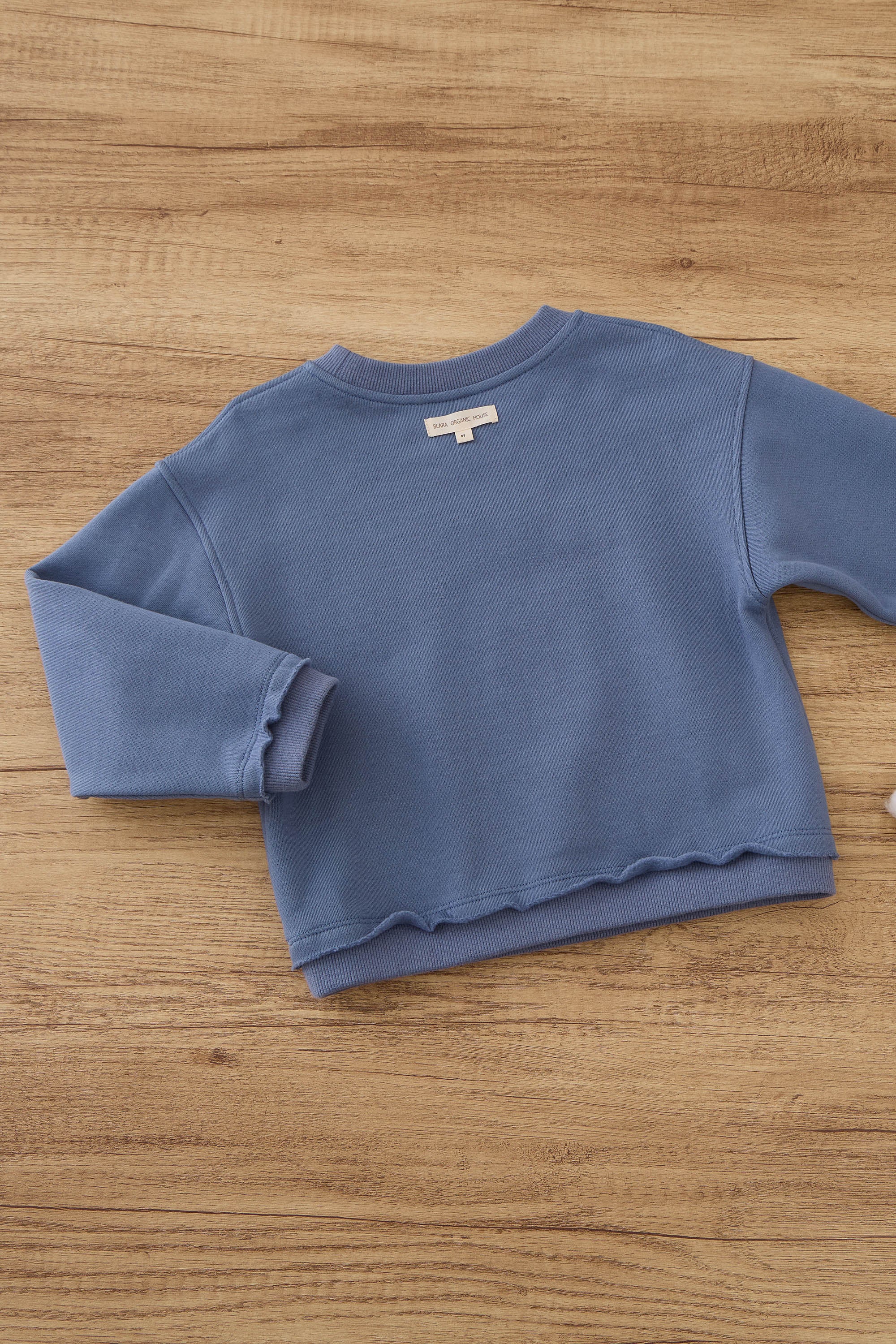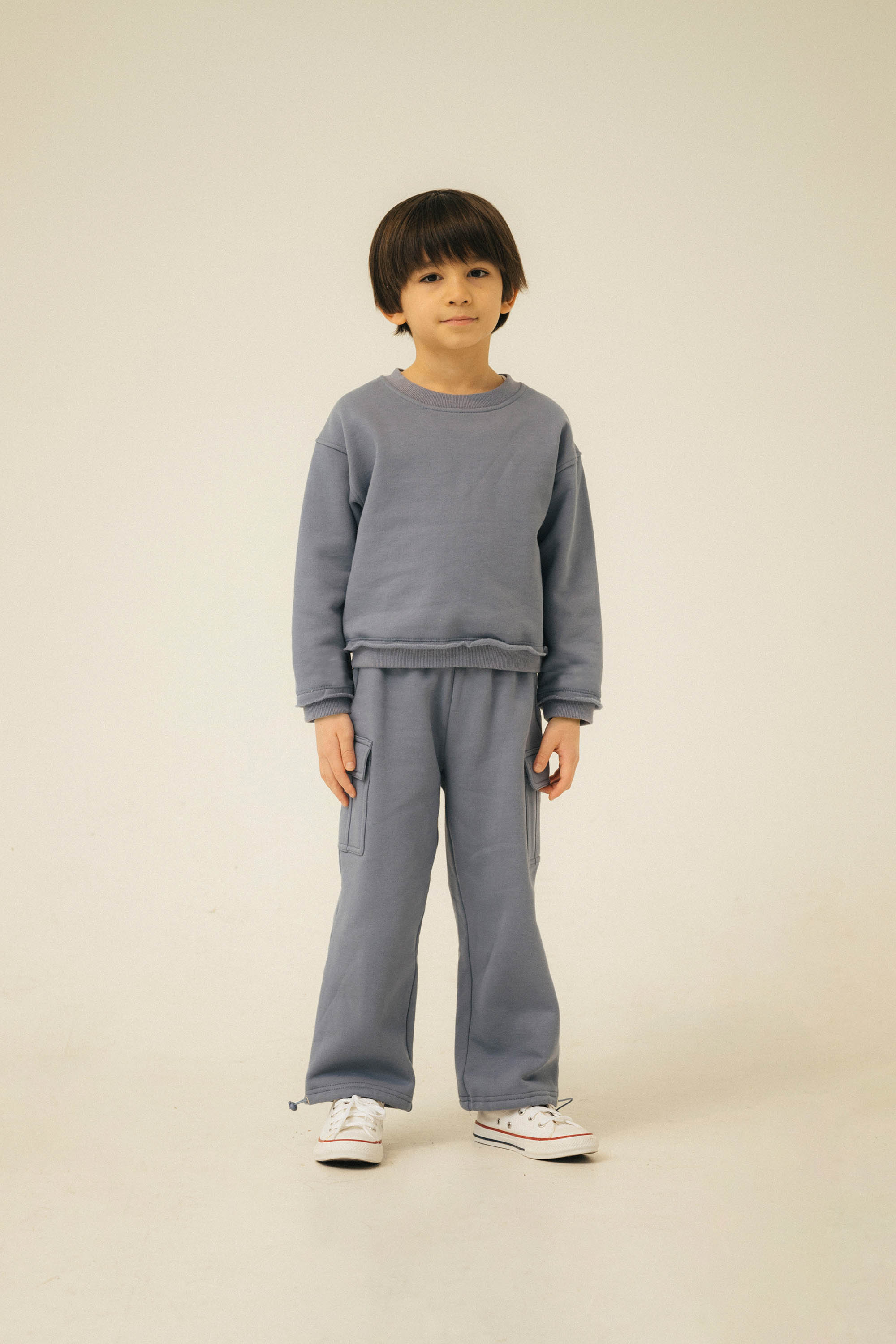 This relaxed kids sweatshirt is thoughtfully designed with a raw hem finish at the bottom that transitions smoothly into ribbing, creating a balanced mix of ease and structure that feels casual, modern, and comfortable for everyday wear. The soft fabric drapes gently on the body, making it an easy piece for children to layer over tees or wear on its own throughout the fall and winter seasons when they need a little extra warmth during school days, outdoor play, or cozy moments at home. Its simple and versatile silhouette pairs well with many outfits, allowing it to become a practical and dependable wardrobe staple for cooler weather. Crafted from 100 percent GOTS certified premium Organic Cotton, this sweatshirt reflects a thoughtful approach to environmental and social responsibility. The cotton is grown without toxic pesticides or synthetic fertilizers, resulting in a fabric that feels gentle and safe on children’s skin.