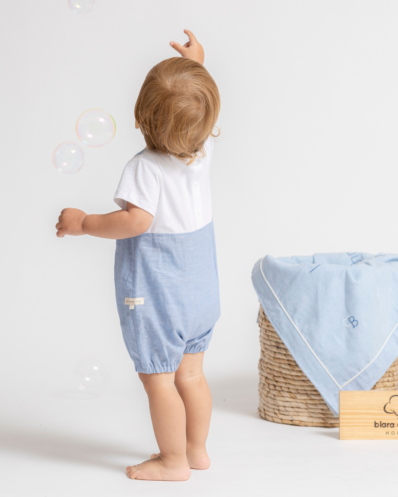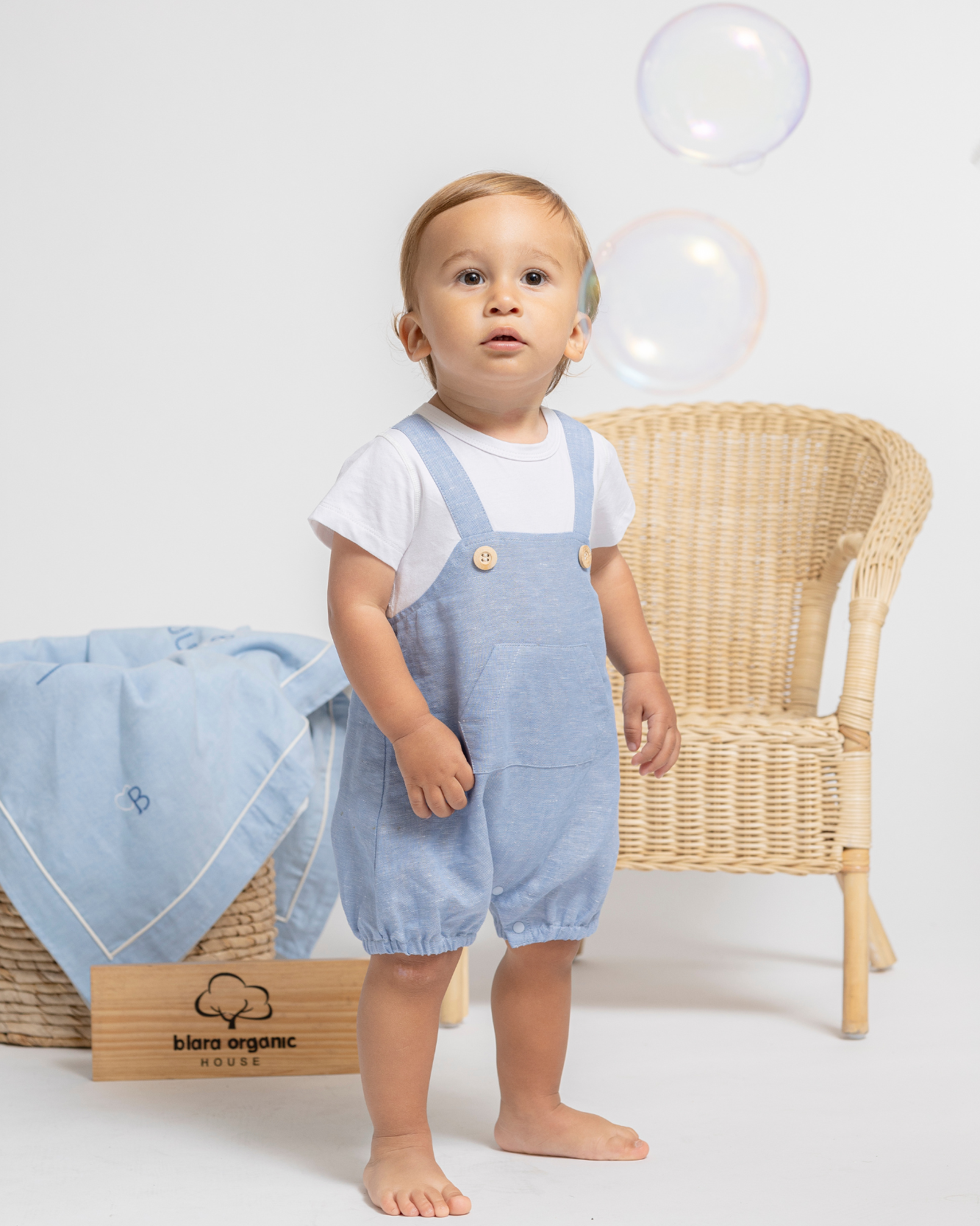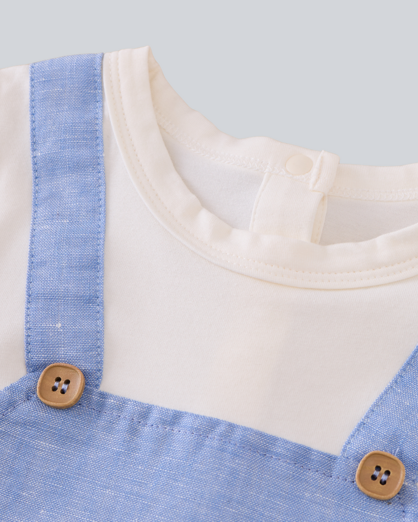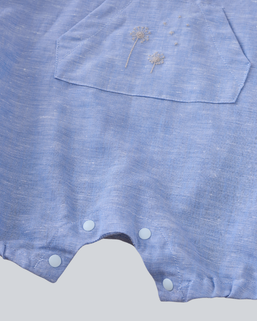 Natural blue and white bodysuit set for boys, made from soft cotton linen and stretchy Jersey for comfortable wear. Designed to look like two pieces, the dungaree shortie has decorative buttons on the front. The pouch pocket is detailed with Dandelion embroidery. There are popper snap fastenings on the back and between the legs to make dressing easier.