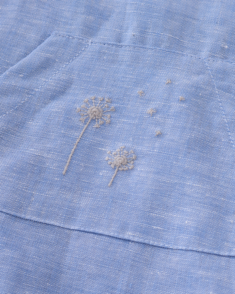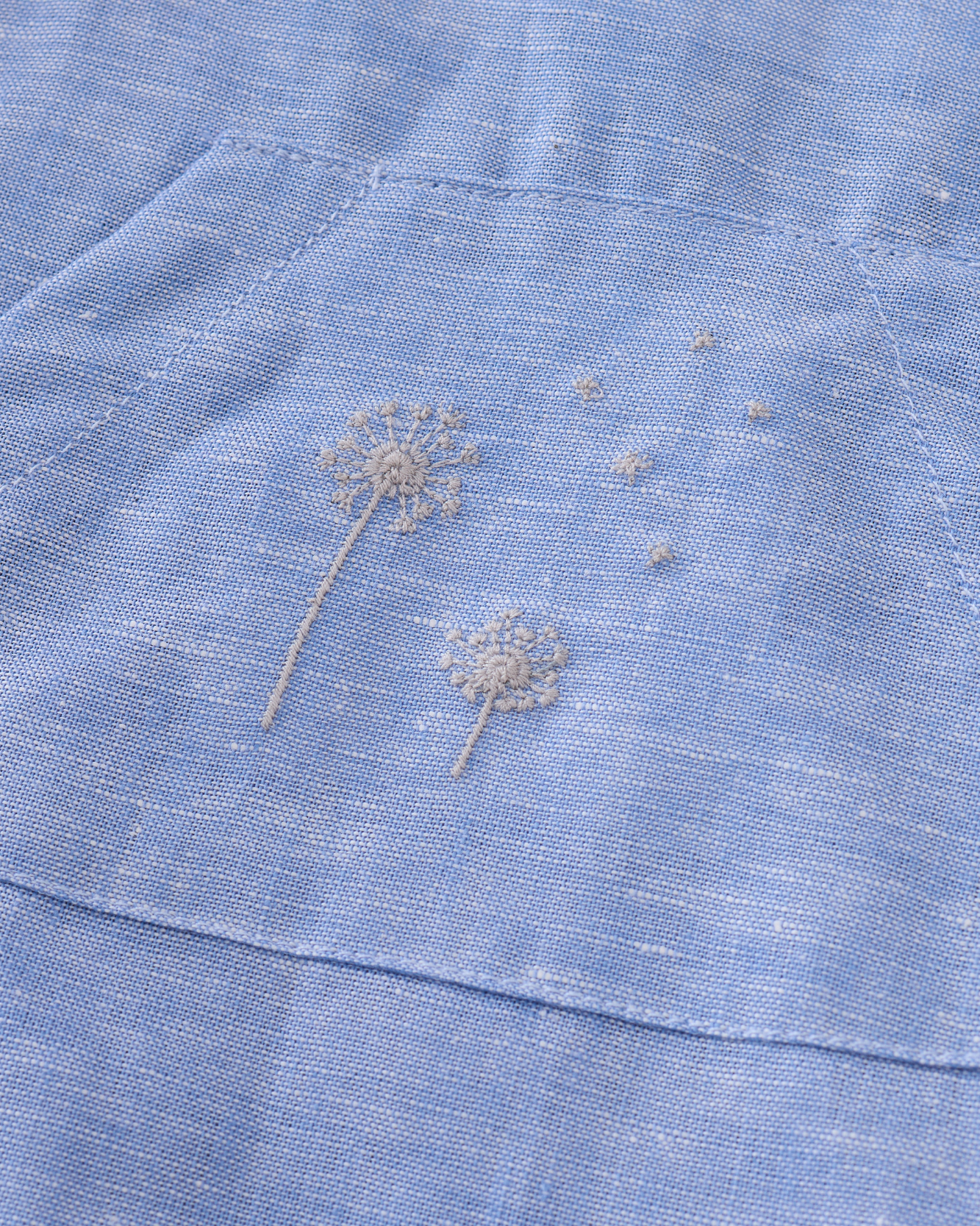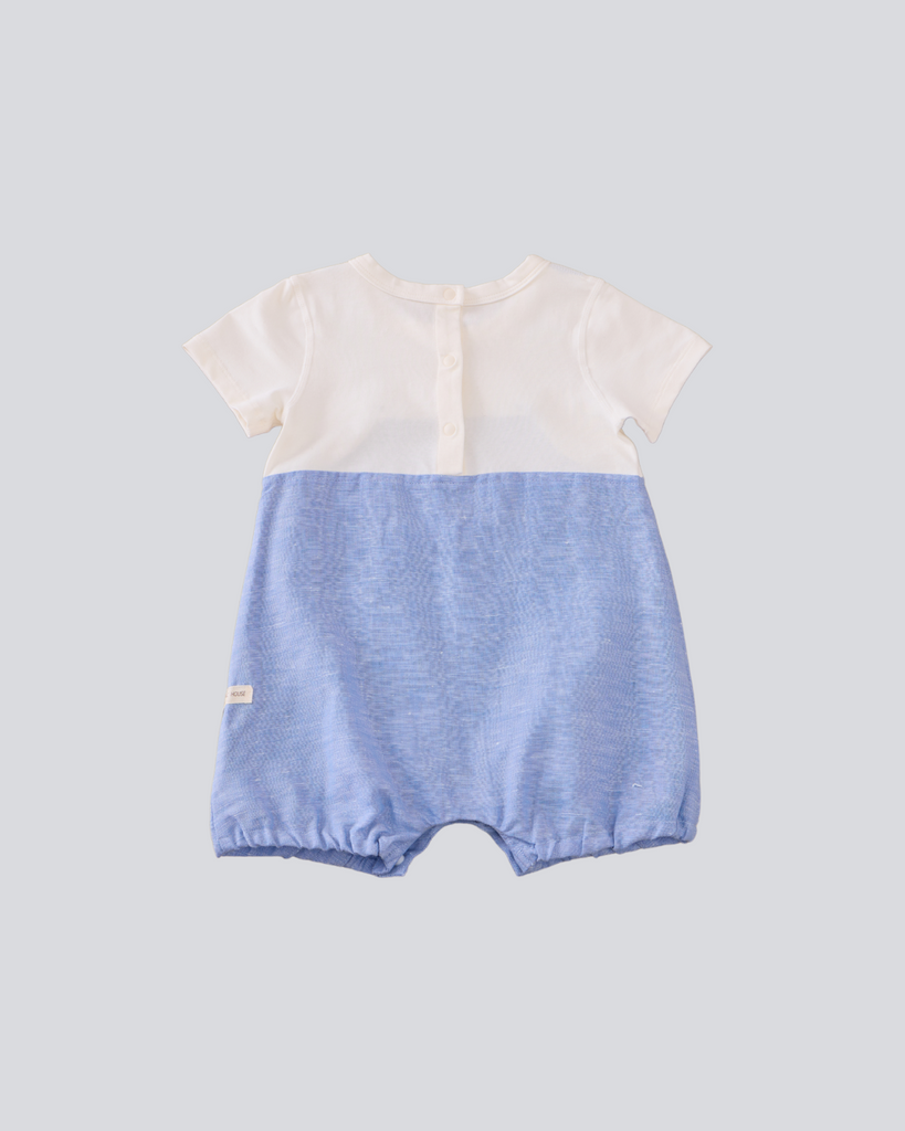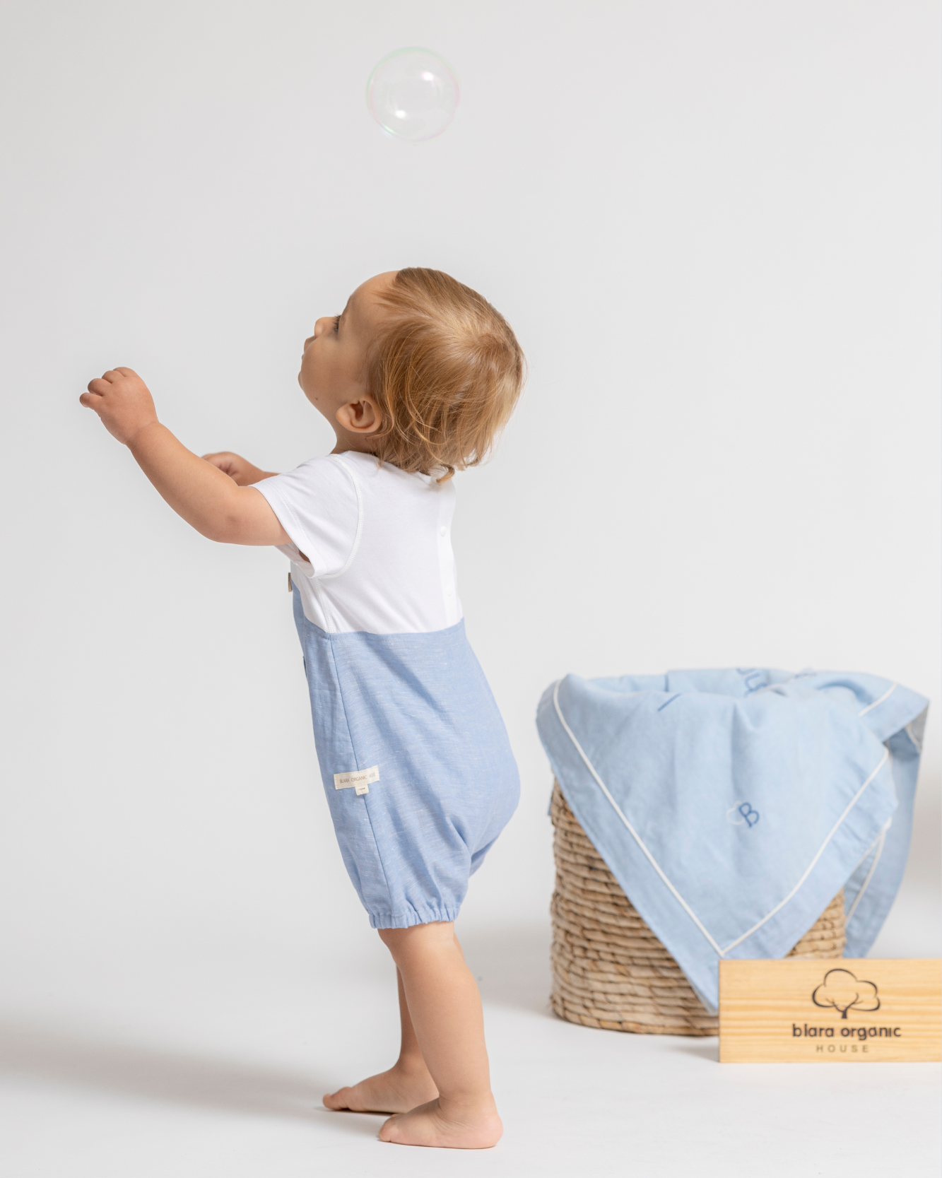 Natural blue and white bodysuit set for boys, made from soft cotton linen and stretchy Jersey for comfortable wear. Designed to look like two pieces, the dungaree shortie has decorative buttons on the front. The pouch pocket is detailed with Dandelion embroidery. There are popper snap fastenings on the back and between the legs to make dressing easier.