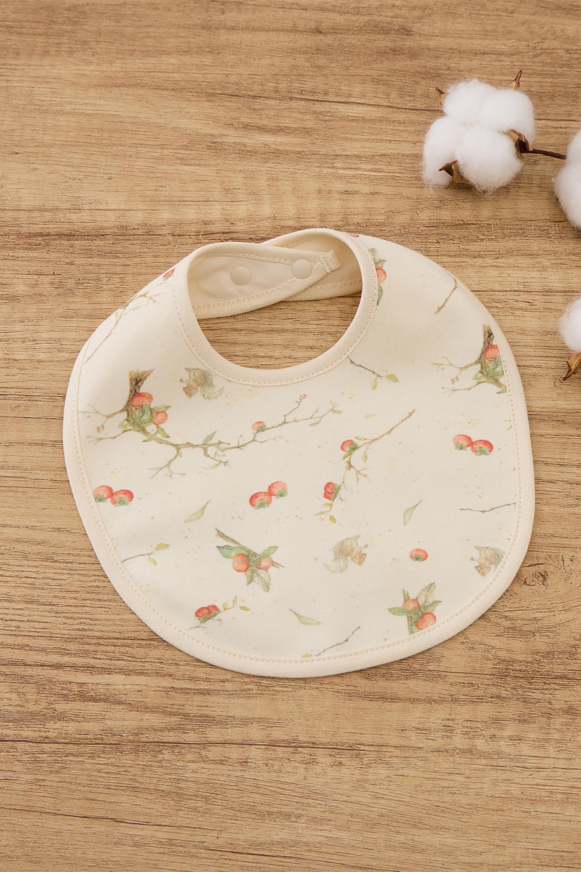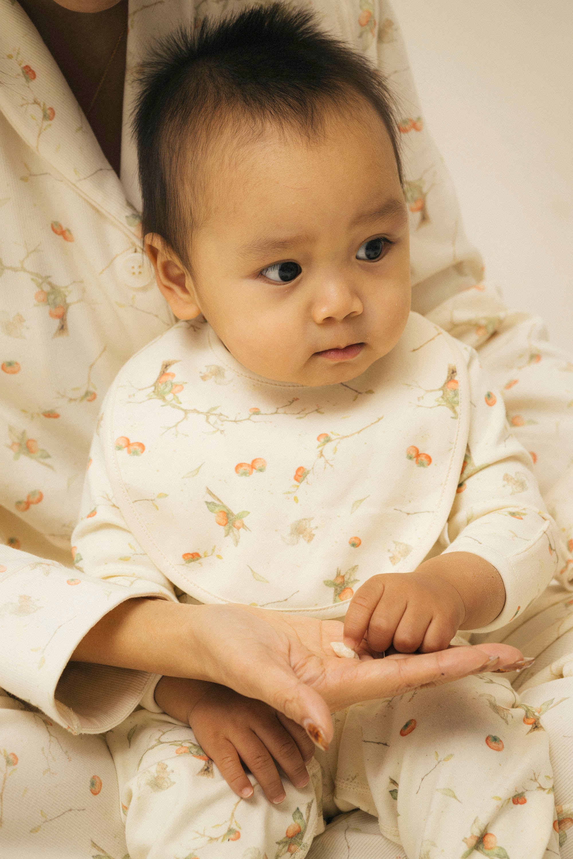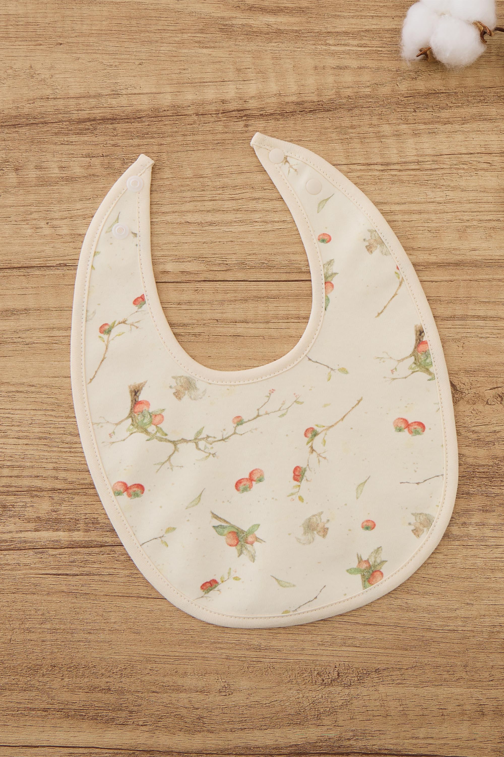 This classic bib features a timeless design with a snap closure at the back for a secure fit, making it simple to put on and remove. The soft, absorbent fabric helps keep clothes clean during mealtime, offering both functionality and style. Persimmons, the fruit of autumn, full of warmth and vitality. Under the moonlight, the whole tree brims with persimmons, symbolizing prosperity and abundance. In Chinese culture, persimmons represent "wishful fulfilment," and we embrace this meaning, especially for overseas Chinese. Through this series, we aim to bring festive cheer and blessings to our Chinese communities abroad. This New Year collection expresses our heartfelt wishes to all families and newborns. We wish every baby to grow up healthy and strong, and for every family to enjoy happiness, good health, and a year of abundant blessings. 100% Organic Cotton. One size for 0-6M babies.