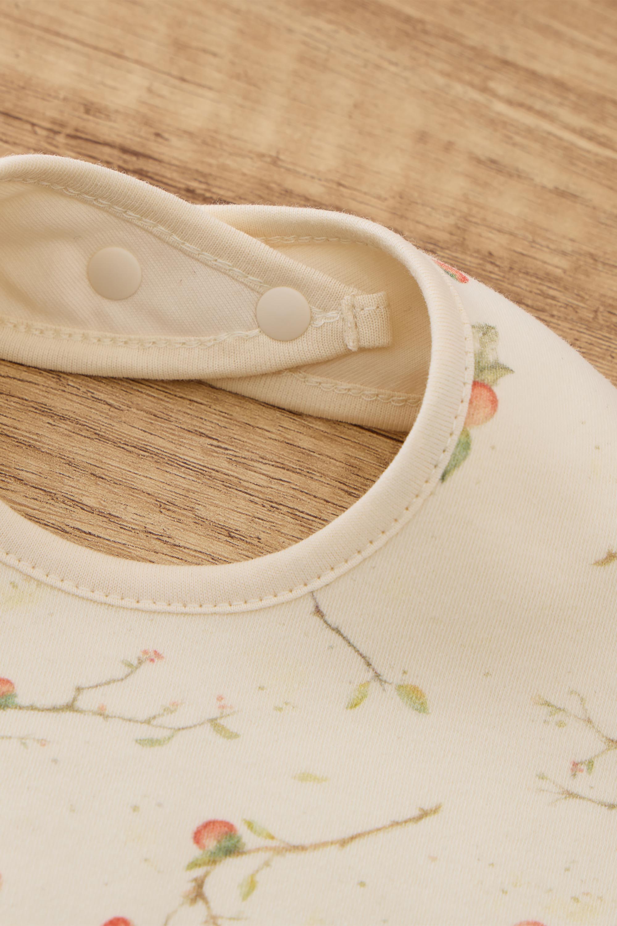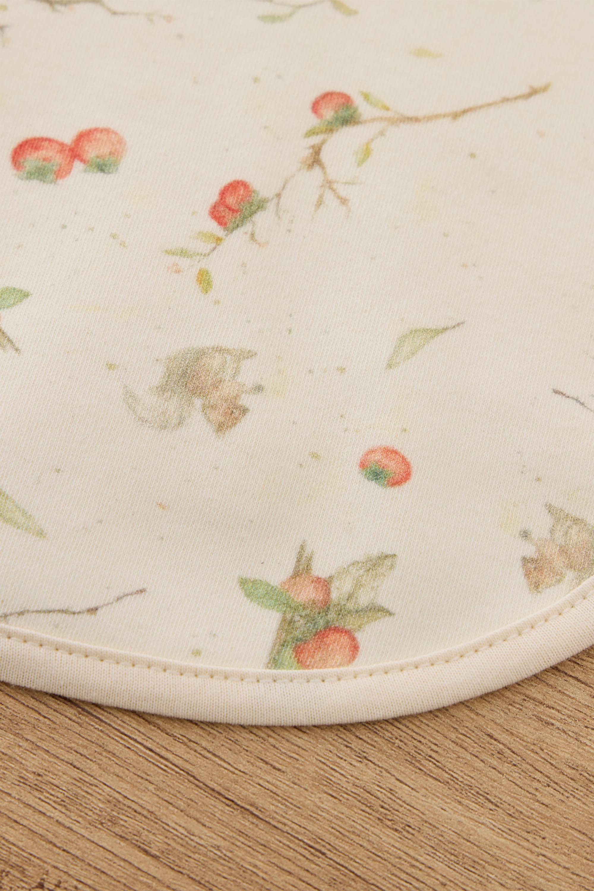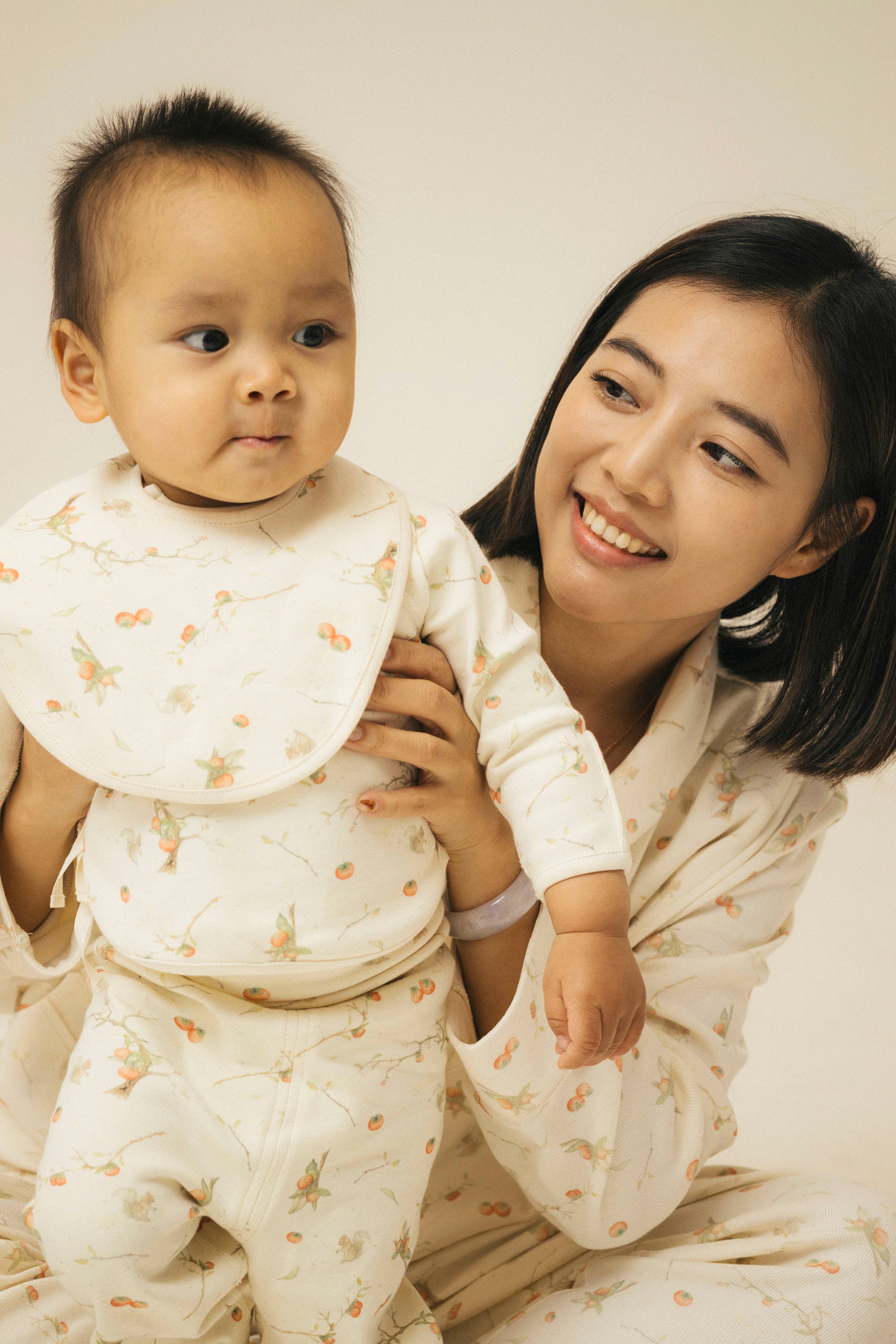 This classic bib features a timeless design with a snap closure at the back for a secure fit, making it simple to put on and remove. The soft, absorbent fabric helps keep clothes clean during mealtime, offering both functionality and style. Persimmons, the fruit of autumn, full of warmth and vitality. Under the moonlight, the whole tree brims with persimmons, symbolizing prosperity and abundance. In Chinese culture, persimmons represent "wishful fulfilment," and we embrace this meaning, especially for overseas Chinese. Through this series, we aim to bring festive cheer and blessings to our Chinese communities abroad. This New Year collection expresses our heartfelt wishes to all families and newborns. We wish every baby to grow up healthy and strong, and for every family to enjoy happiness, good health, and a year of abundant blessings. 100% Organic Cotton. One size for 0-6M babies.