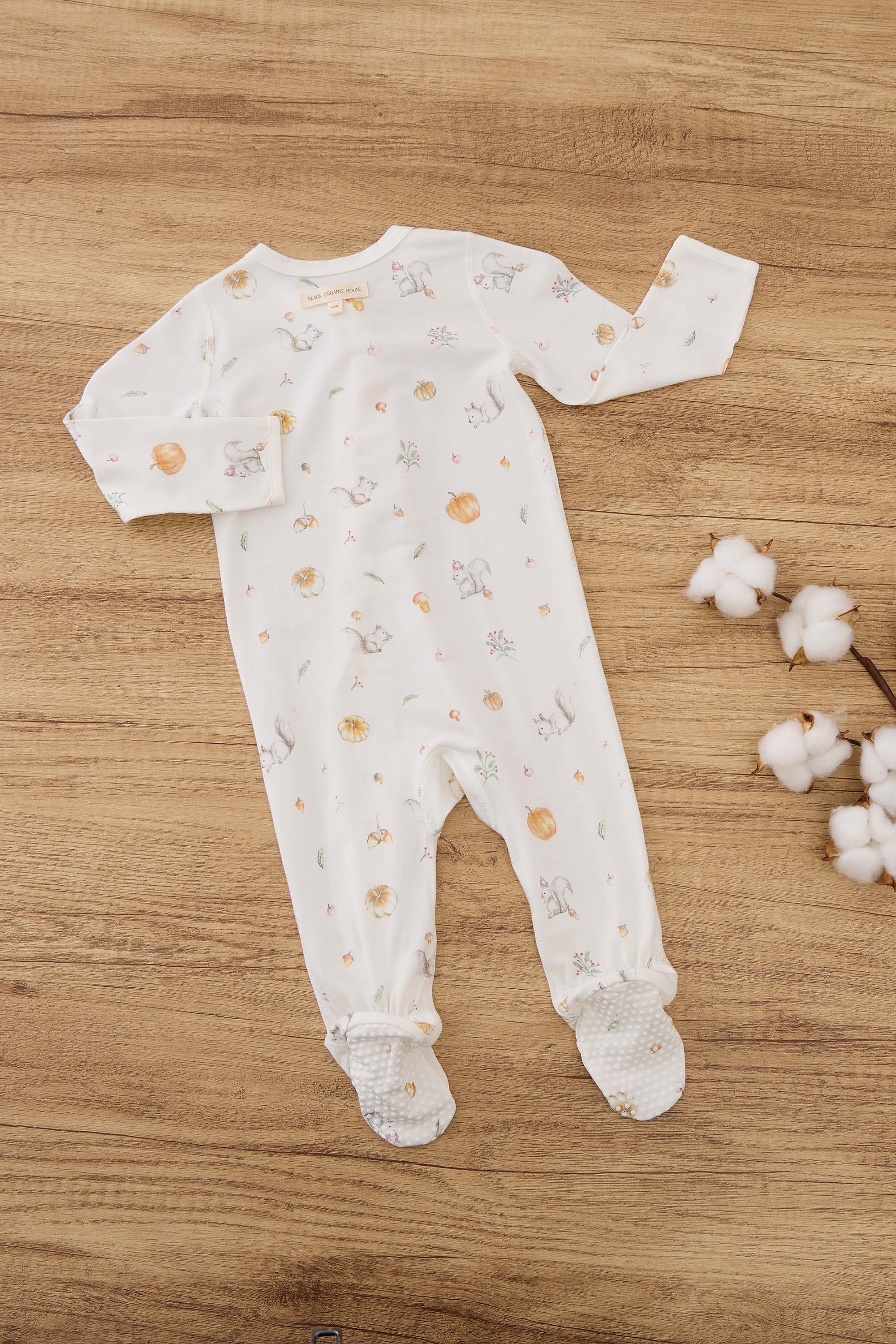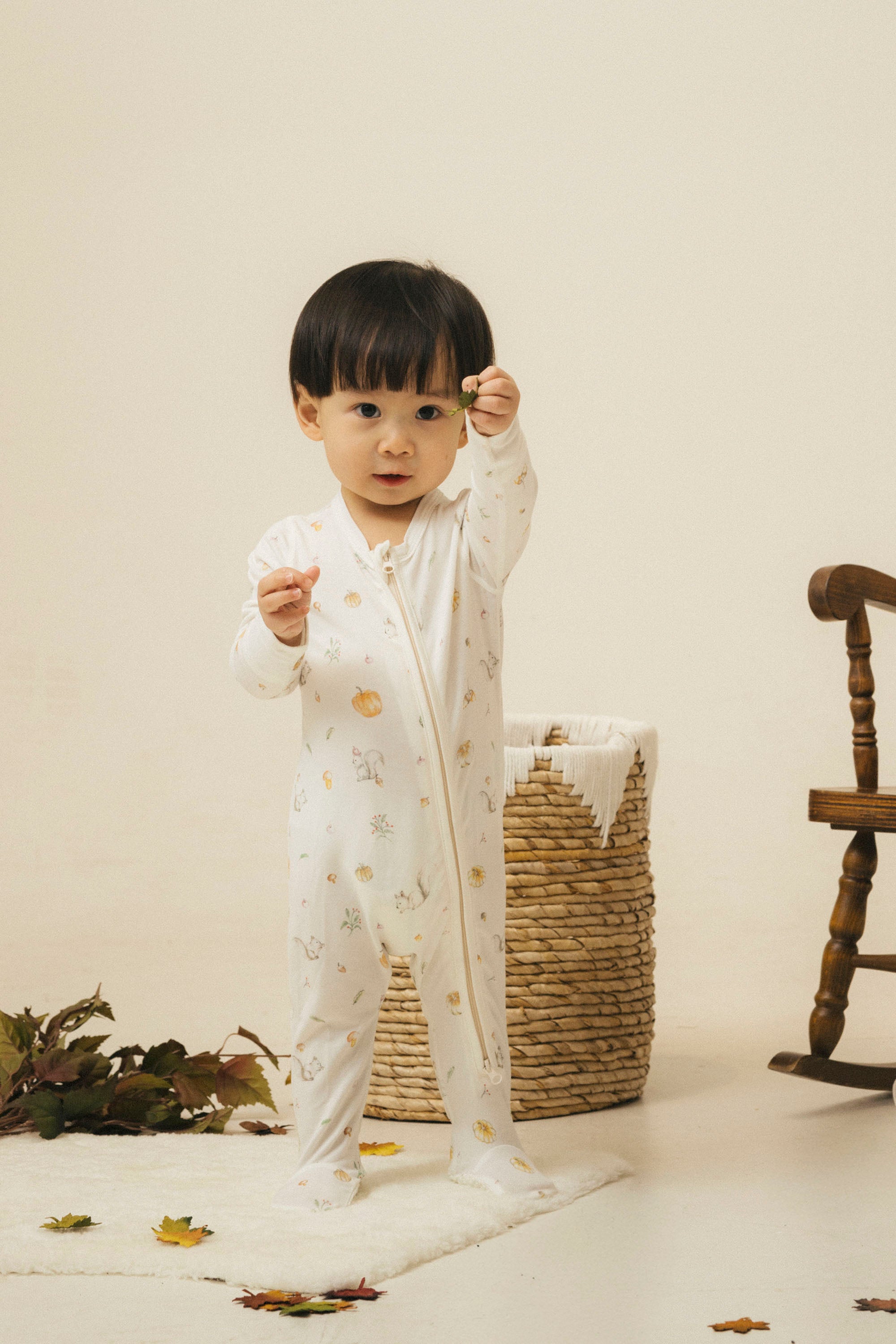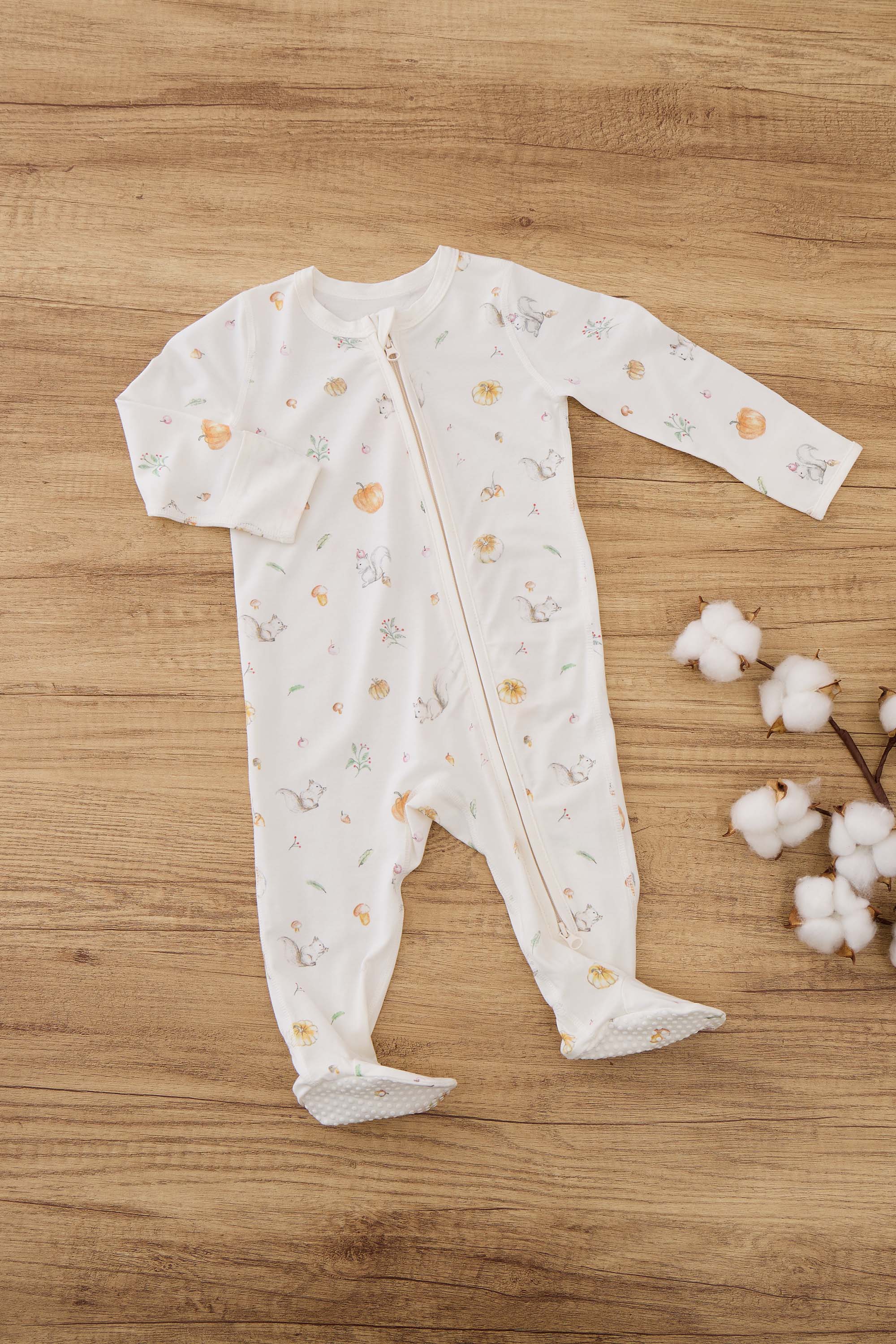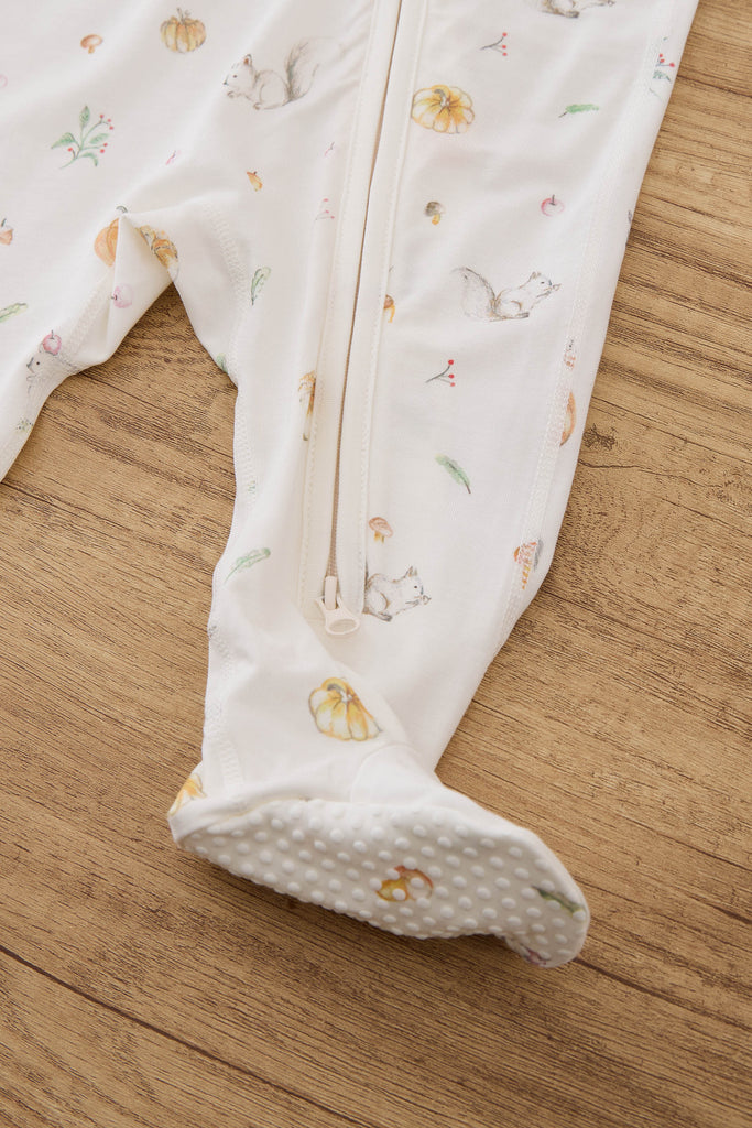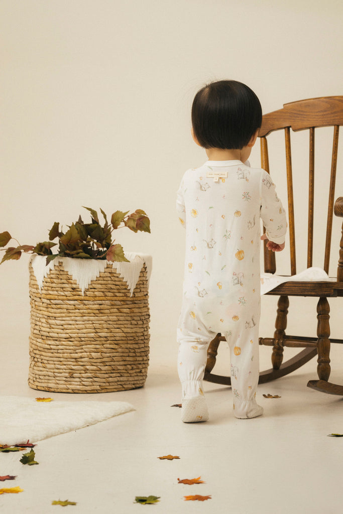 Our signature sleeping romper is designed for ultimate comfort. Featuring footies and a full-length zipper from the center front to the feet, this romper makes bedtime and changing a breeze. The soft, breathable fabric ensures a snug, cozy fit for peaceful sleep. In Canada, squirrels are everywhere: on the trees by the window, on neighbors' rooftops, or in the grass by the roadside. Imagine a squirrel holding a pinecone, gently tapping on your window in the morning sunlight, or a little squirrel hopping across the road. We naturally slow down, waiting for them to safely cross before continuing on our way. This occasional slowdown and the harmony with nature are what the founder wants to express through this illustration. Of course, pumpkins and Halloween are always key moments of joy and memories in a child’s growth.