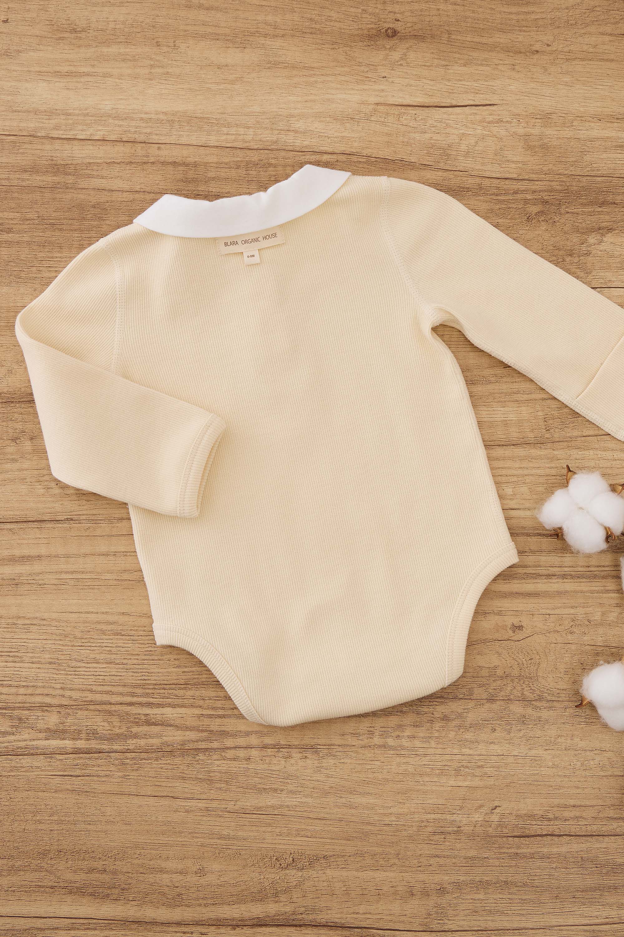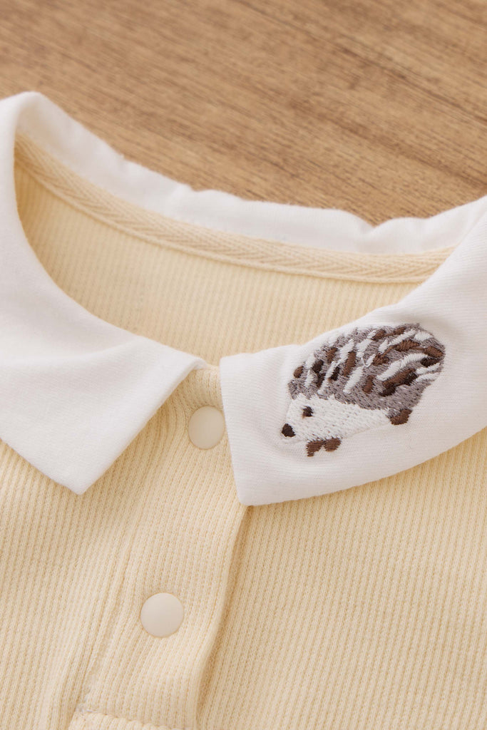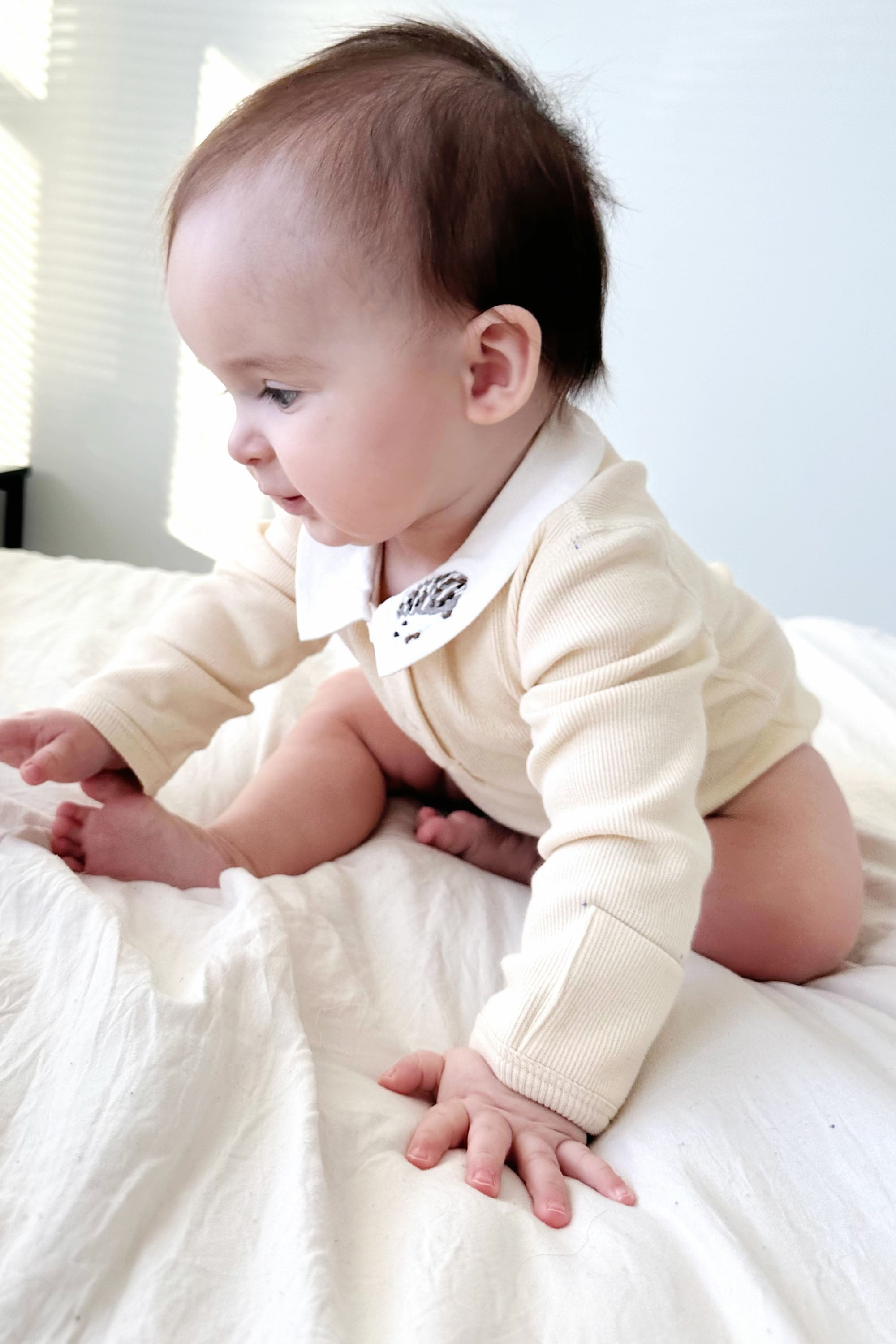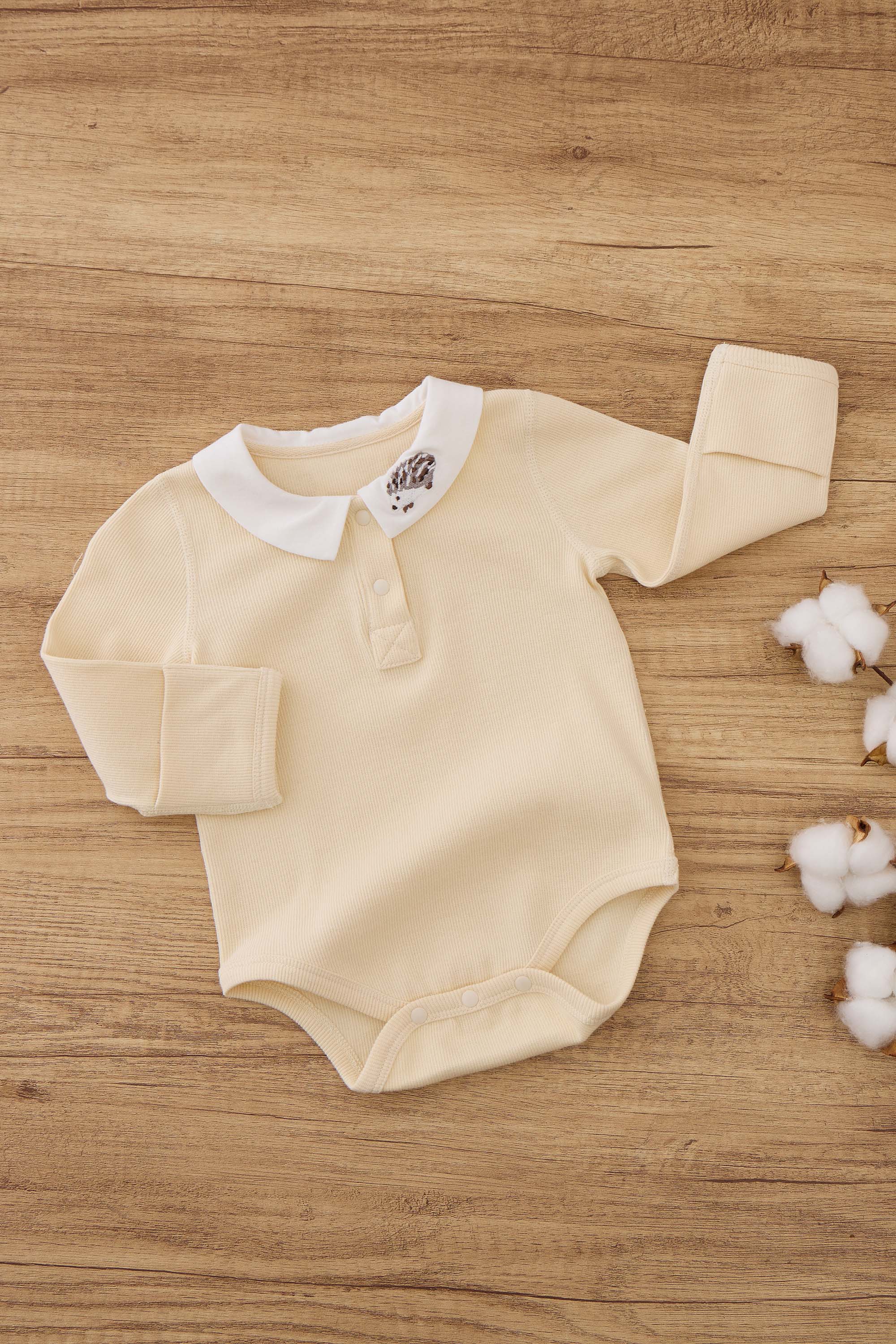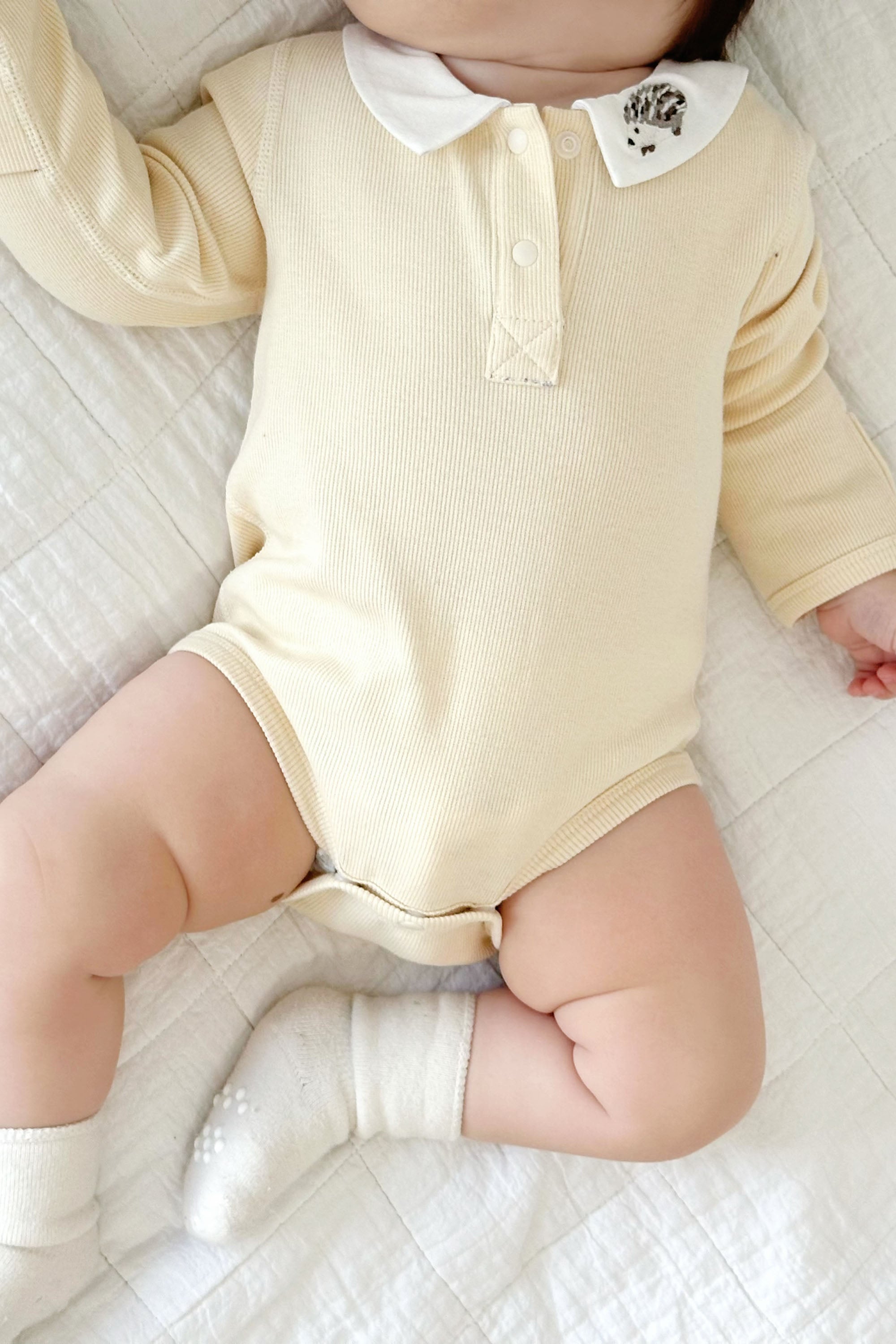 In the autumn woods, colors blend, green still holding on, deep oranges, soft golds, and the signature maple red of Canada. The founder often finds time to walk through nearby forests, drawing inspiration and healing from nature. This scene captures a curious hedgehog sharing pumpkins with a shy rabbit in the woods just like our little ones, some are lively, others quiet. As parents, we celebrate their uniqueness, and in our busy lives, we remember to slow down, refresh, and make space for imagination. This pretty bodysuit combines timeless style with everyday comfort. Featuring a classic collar and center front placket, it’s perfect for dressing up or down and designed with your baby's comfort in mind while keeping them looking effortlessly chic.