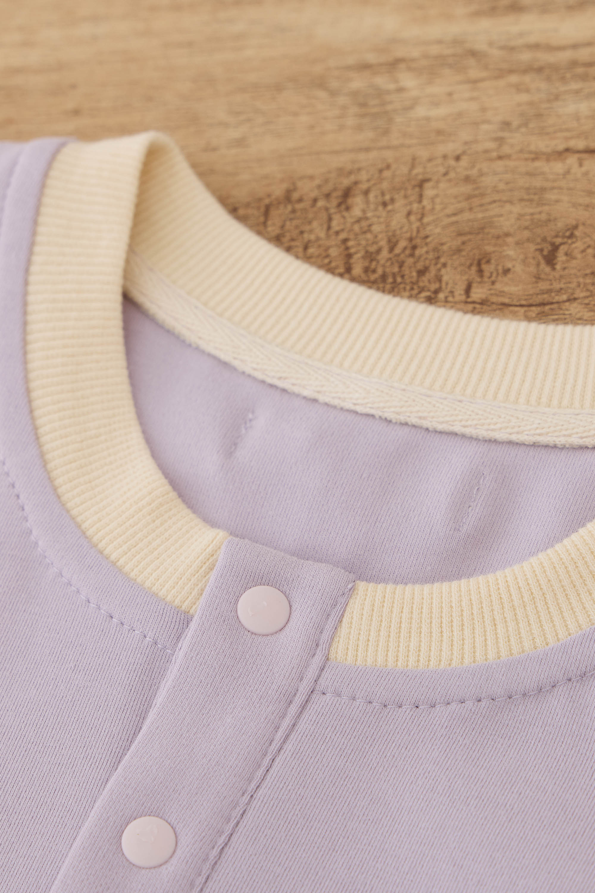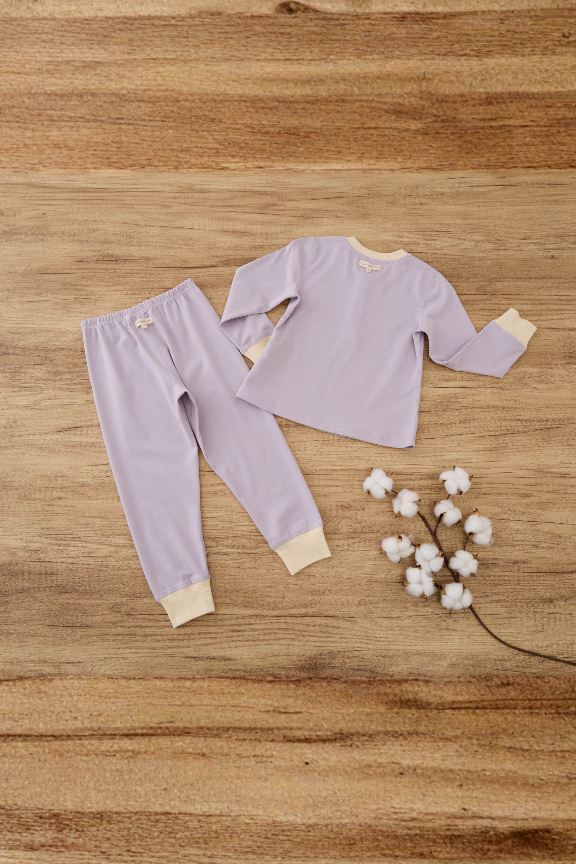 Inspired by nature’s colours, this collection features muted purple and earthy brown, both created using natural dyes from plants, roots, and flowers. Combined with organic cotton, these fabrics are skin-friendly, breathable, moisture-wicking, antibacterial, anti-itch, hydrating, and UV-resistant. Naturally eco-friendly, they are ideal for sensitive skin. The art of natural dyeing lends each piece a unique, handcrafted quality while embracing sustainability. These soft, understated colours evoke a sense of warmth and connection to nature, encouraging us to slow down and appreciate its simple, pure beauty. This cozy Henley pajama set combines style and comfort for a restful night’s sleep. The color-blocked Henley top brings a playful, modern look, while the button-down front adds a touch of classic charm. Paired with matching color-blocked pajama pants featuring an elasticated waistband, this set ensures a relaxed fit that’s perfect for lounging or sleeping, allowing little ones to stay comfortable all night.