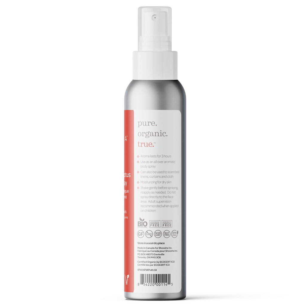 Shoosha Organic Summer Spray is an organic, effective, deet-free, and delightful alternative to chemical bug repellents. It follows inspiration from aromatherapy and uses a beautiful fusion of oils - Lemon Eucalyptus, Lemongrass, Organic Rose Geranium, Organic Cedarwood, and Organic Peppermint - that pleases our senses while keeping mosquitoes and other insects out of our way. As an organic product, it is also safe for the environment, whether you're in a forest, by a lake, or on a trail!