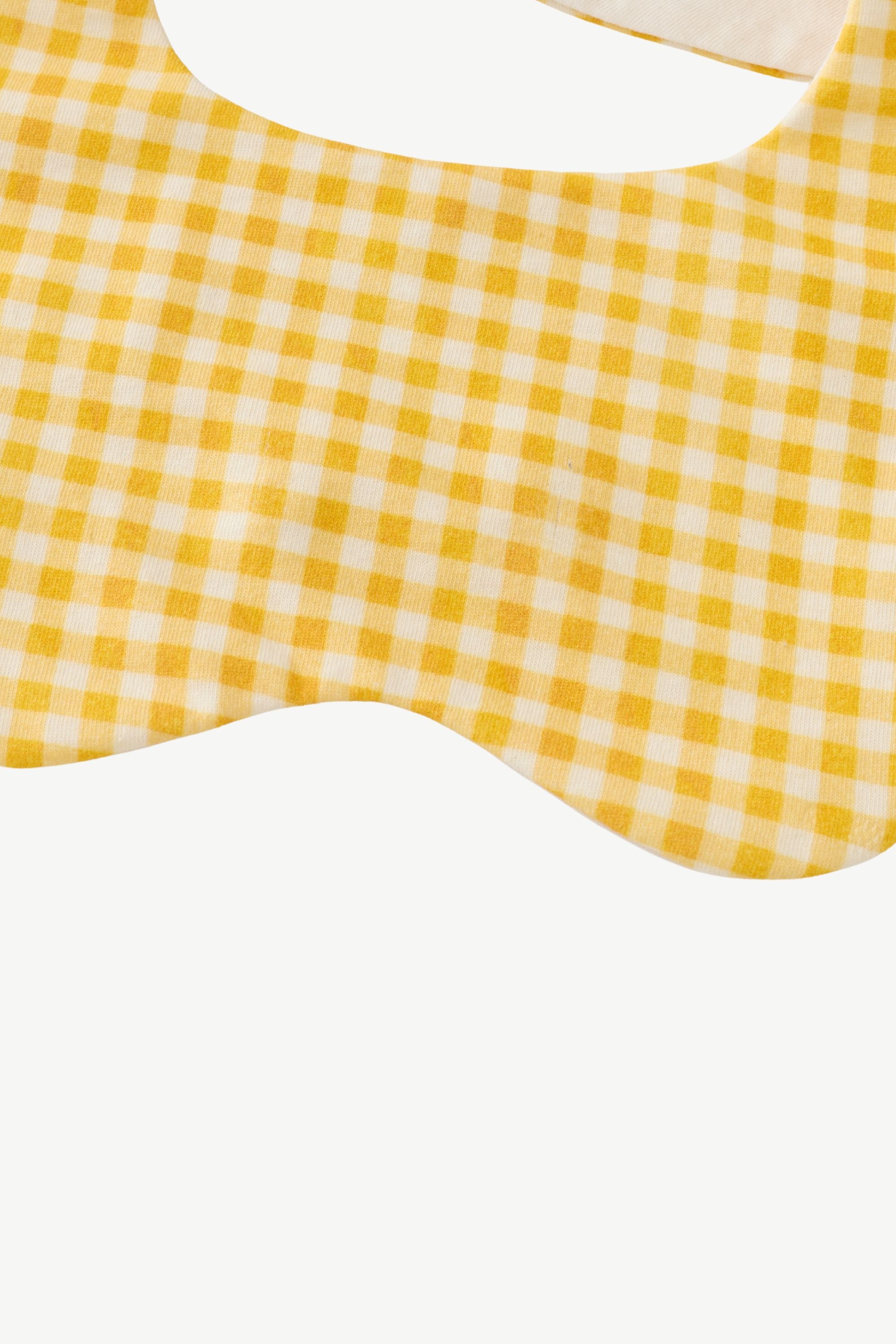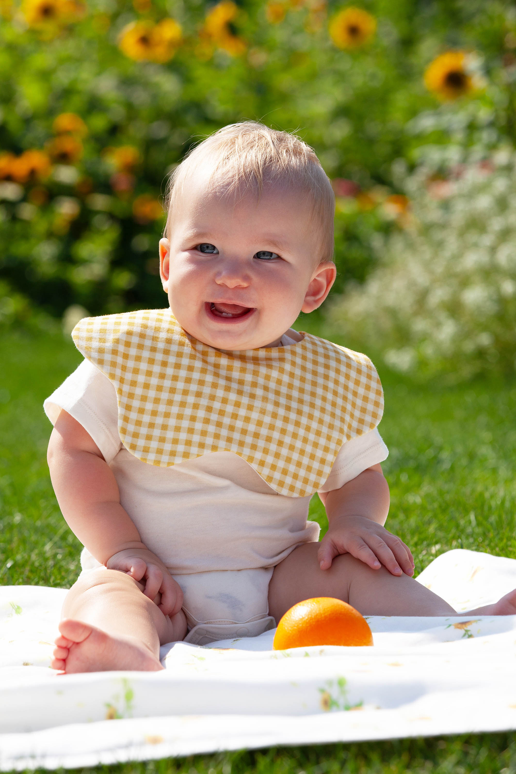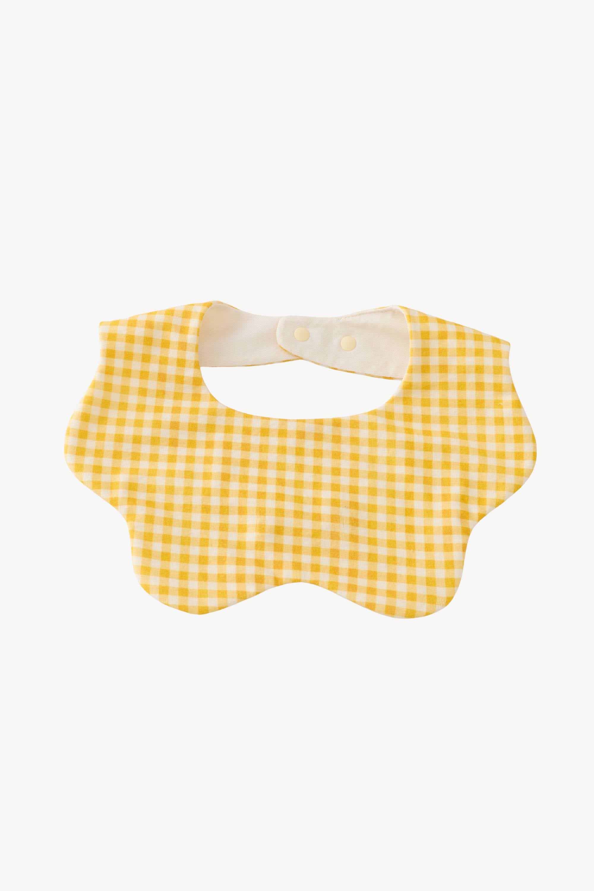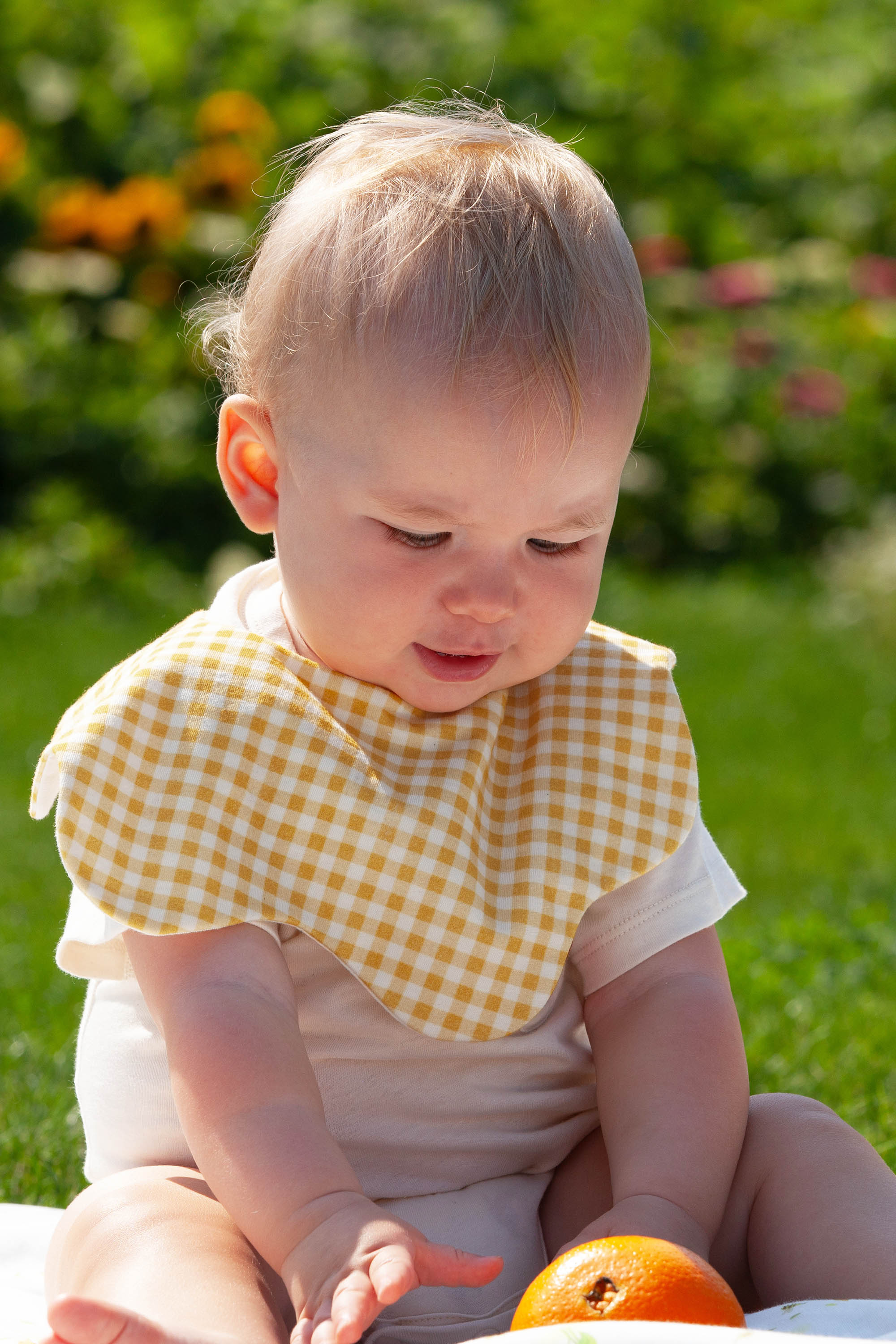 With a playful wavy edge and breathable fabric, this bib keeps outfits dry while adding a cute touch to your little one's outfits. The "Golden Picnic" Collection is the latest addition to our Pastel Plaid Collection featuring a whimsical and playful theme. Dyed with turmeric, this natural dye is known to create delicate yellows and is non-irritating to sensitive skin. Our lightweight cotton muslin offers high breathability and smooth texture while our organic cotton spandex jersey provides a cozy and mobile option for active children. These fabrics are designed to stay soft, airy, and comfortable after every wash, maintaining its checkered print for effortless style. Wavy Bib - Yellow Checker