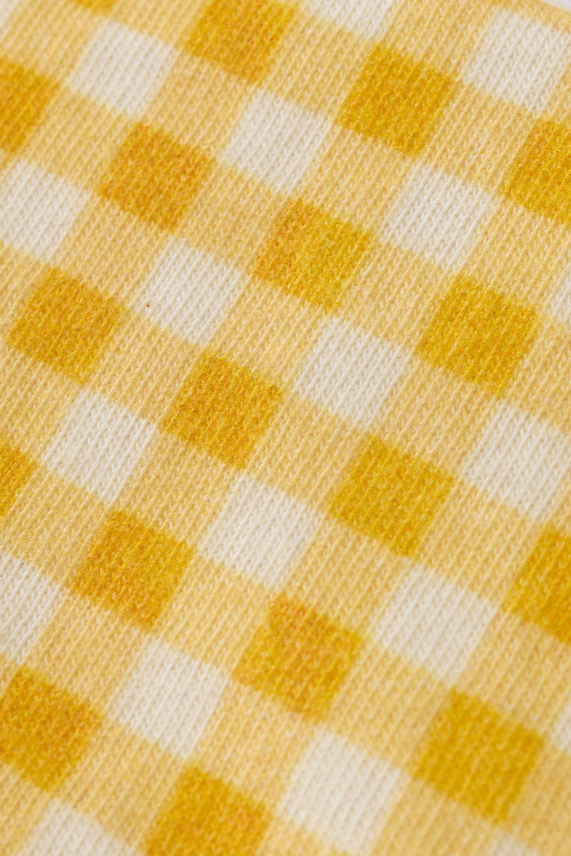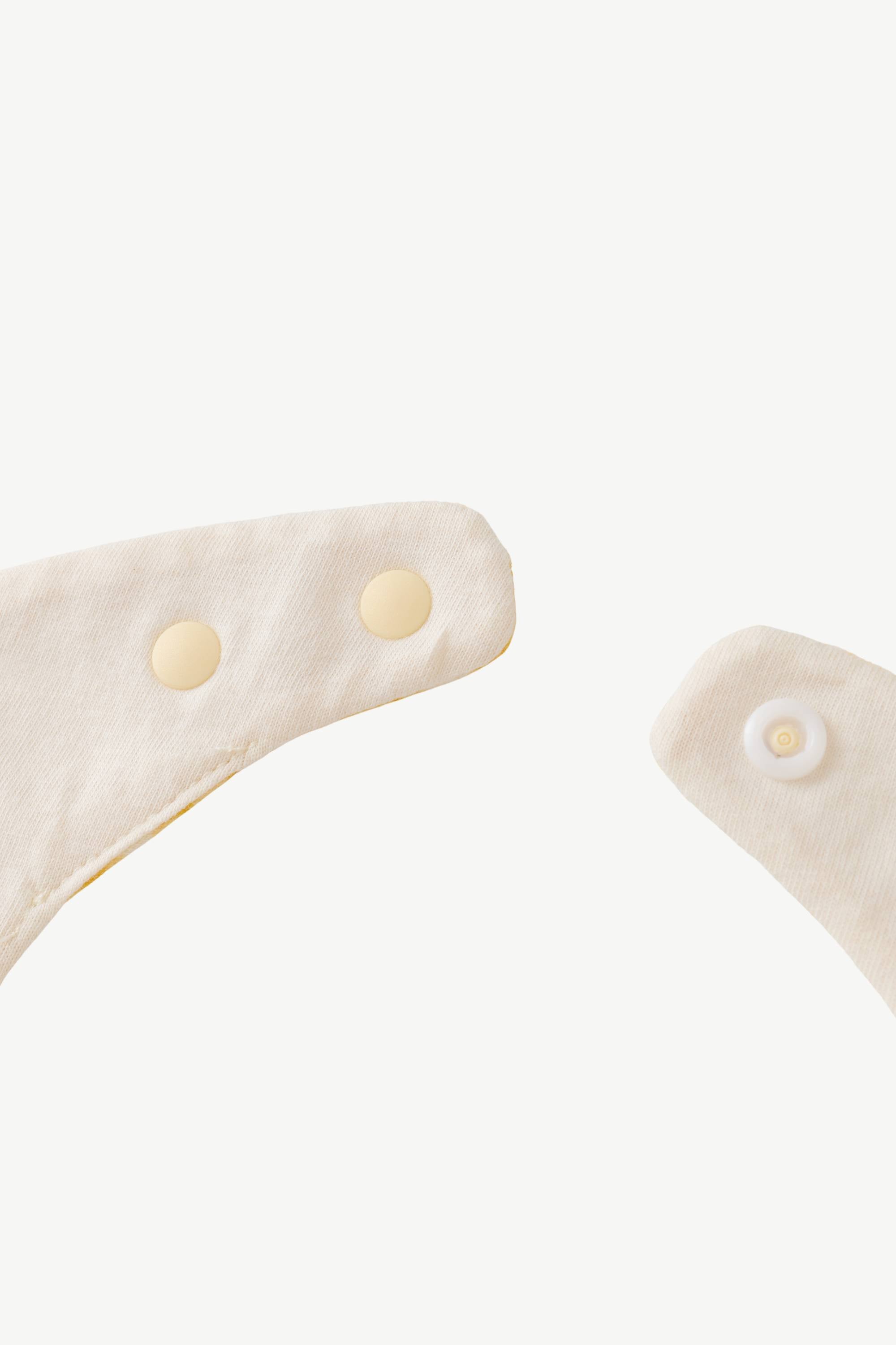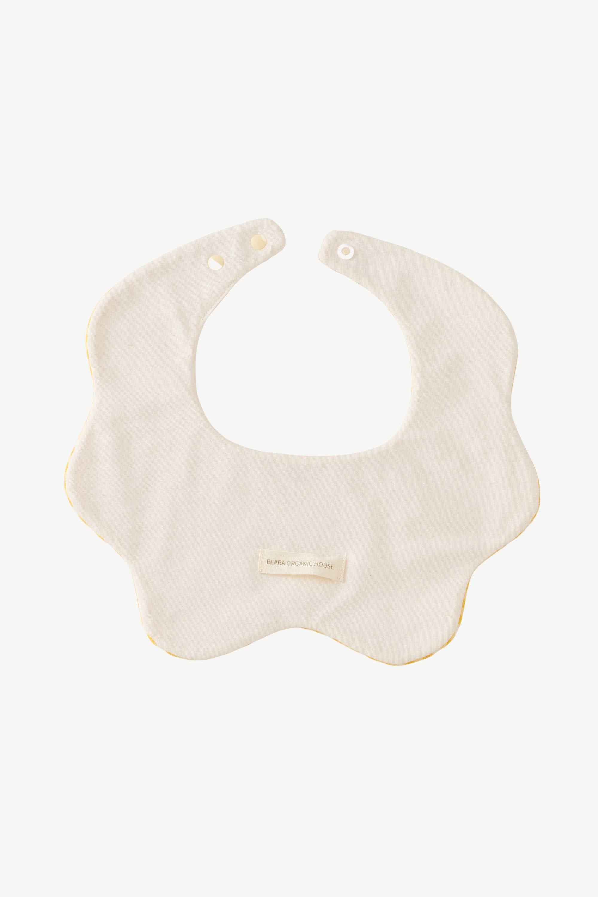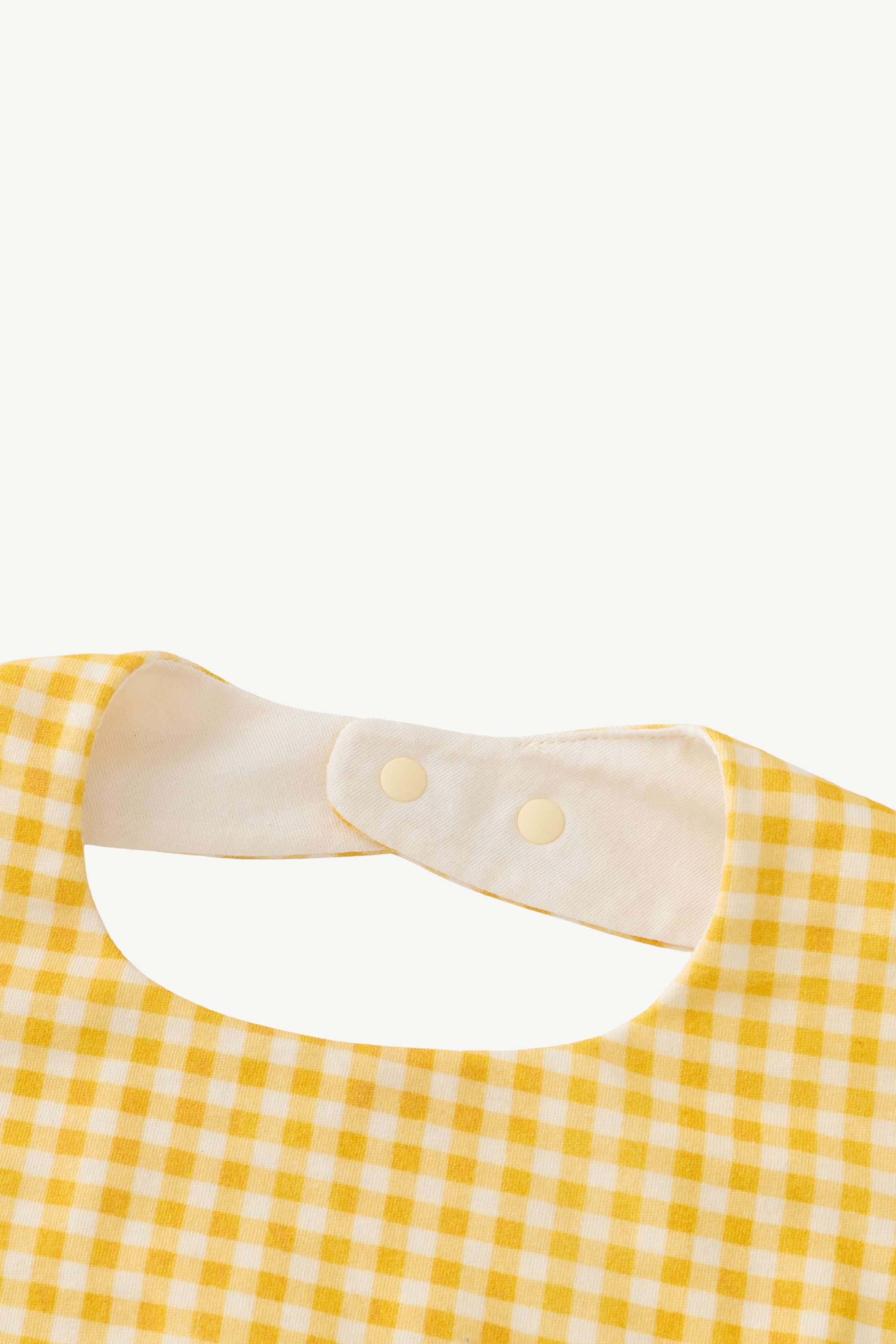 With a playful wavy edge and breathable fabric, this bib keeps outfits dry while adding a cute touch to your little one's outfits. The "Golden Picnic" Collection is the latest addition to our Pastel Plaid Collection featuring a whimsical and playful theme. Dyed with turmeric, this natural dye is known to create delicate yellows and is non-irritating to sensitive skin. Our lightweight cotton muslin offers high breathability and smooth texture while our organic cotton spandex jersey provides a cozy and mobile option for active children. These fabrics are designed to stay soft, airy, and comfortable after every wash, maintaining its checkered print for effortless style. Wavy Bib - Yellow Checker