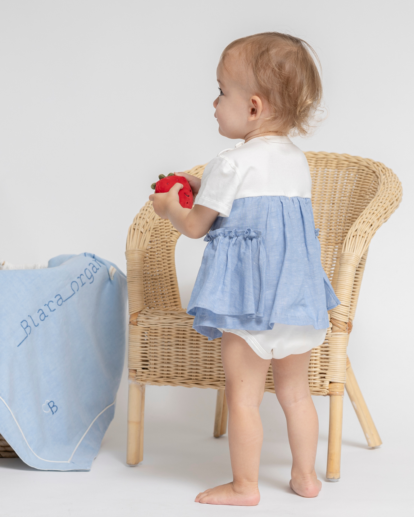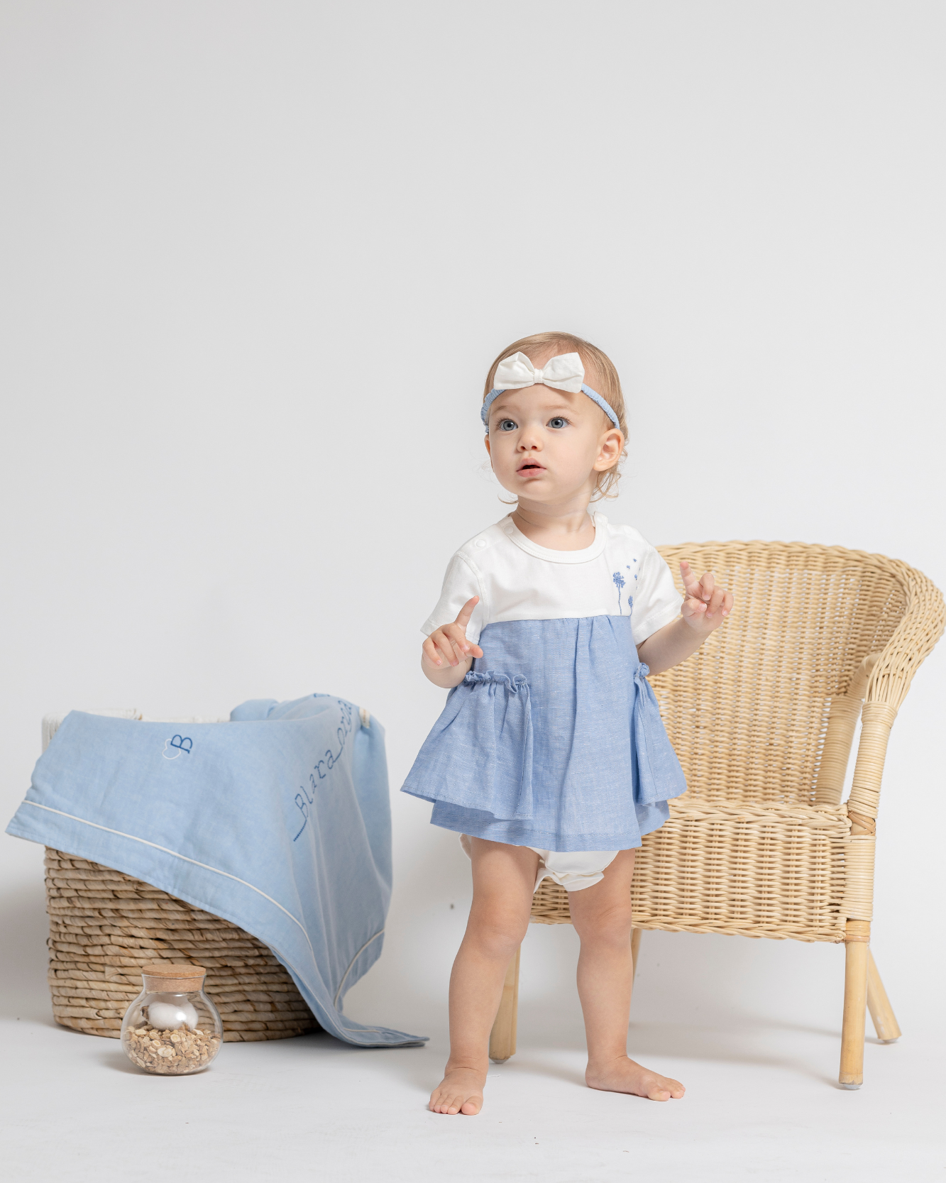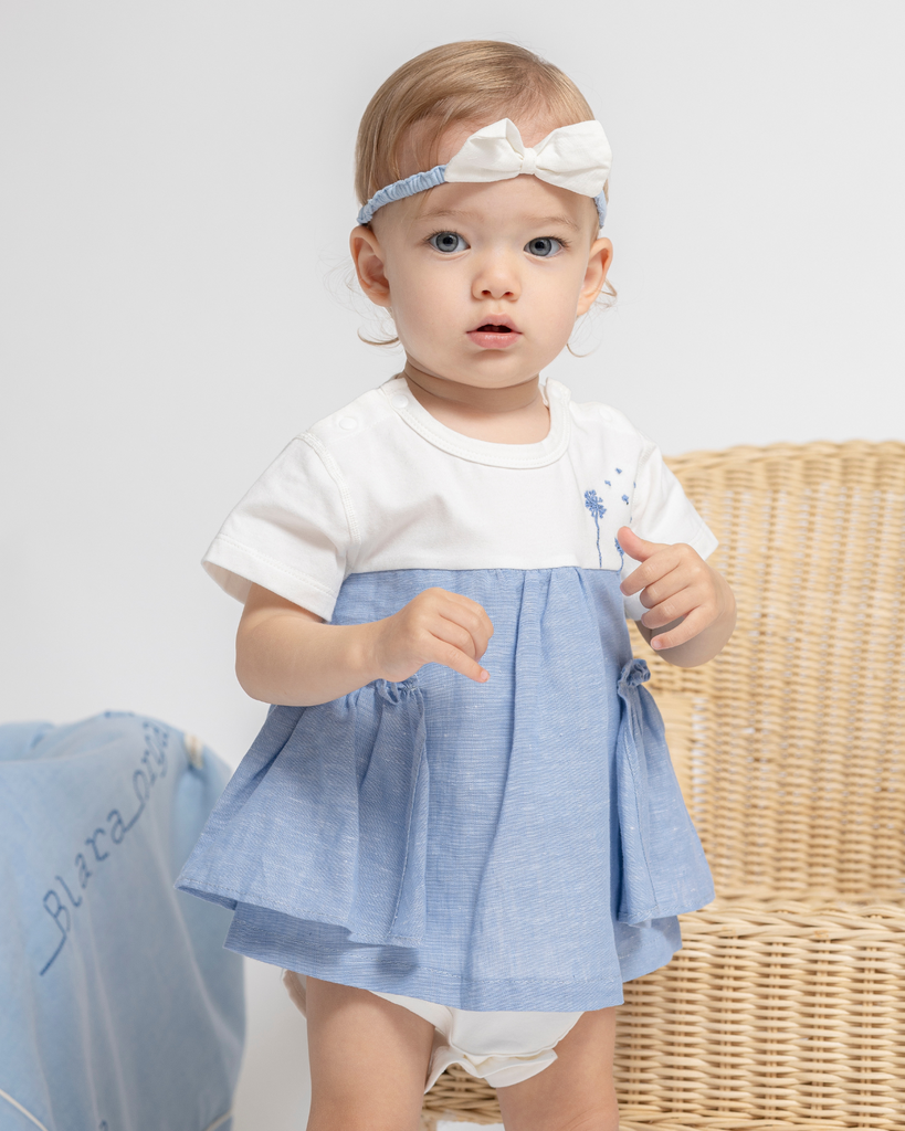 A first summer of casual elegance with this baby girl dress. Made in organic cotton and linen fabrics. The left chest embroidered with Dandelion sits delicately on this easy-going piece, and completed with all-in one bodysuit. There are popper snap fastenings on the back and between the legs to make dressing easier.